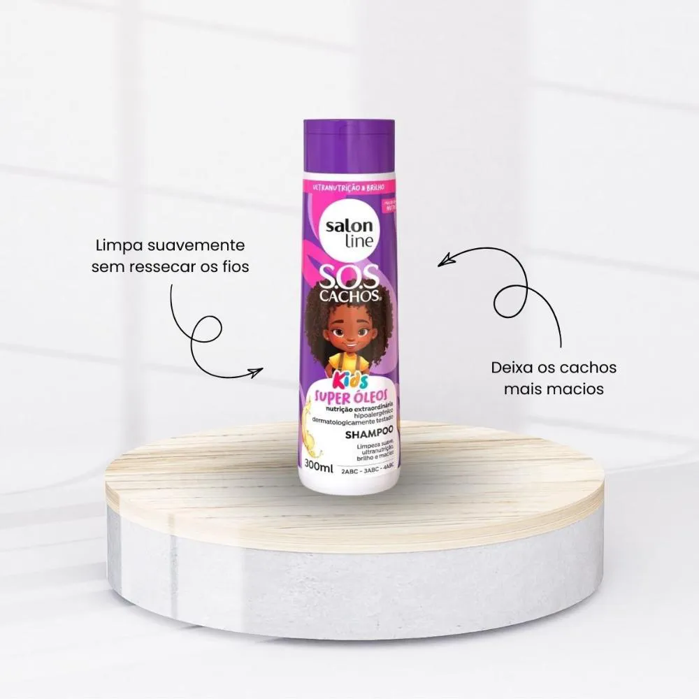 - 01 – Shampoo Salon Line SOS Cachos Kids Super Oleos para Cabelo Cacheado 300mlSugestão de uso complementar