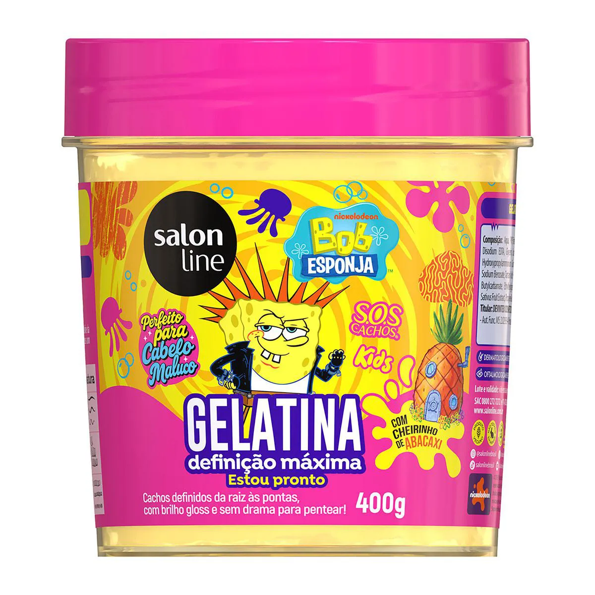 A Gelatina de Cabelo Salon Line S.O.S Cachos Kids Bob Esponja foi desenvolvida especialmente para cuidar dos cachinhos e crespinhos das crianças. Sua fórmula leve e segura garante definição da raiz às pontas, com brilho gloss e um cheirinho irresistível de abacaxi. Além disso, facilita o desembaraço dos fios, tornando o momento do cuidado capilar mais prático e divertido. Ideal para realçar a beleza natural dos fios e proporcionar um acabamento perfeito em penteados e finalizações.
