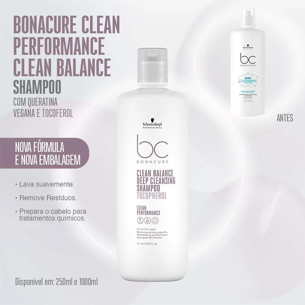 Bonacure Clean Performance: Tecnologia Avançada (queratina vegana e equalizador de células, que trata o cabelo de dentro pra fora), ingredientes de alta performance de skincare em sua fórmula limpa (sem sulfatos, corantes artificiais, silicones, parabenos, óleos minerais e microplásticos), além de ter a embalagem reciclável e feita de até 97% de plástico reciclado. Contém 6 sublinhas, uma para cada necessidade capilar: Repair Rescue (cabelos danificados), Color Freeze (cabelos coloridos), Moisture Kick (cabelos normais a secos, cacheados/ondulados), Volume Boost (cabelos finos), Q10 (cabelos maduros/enfraquecidos) e Clean Balance (todos os tipos de cabelos).