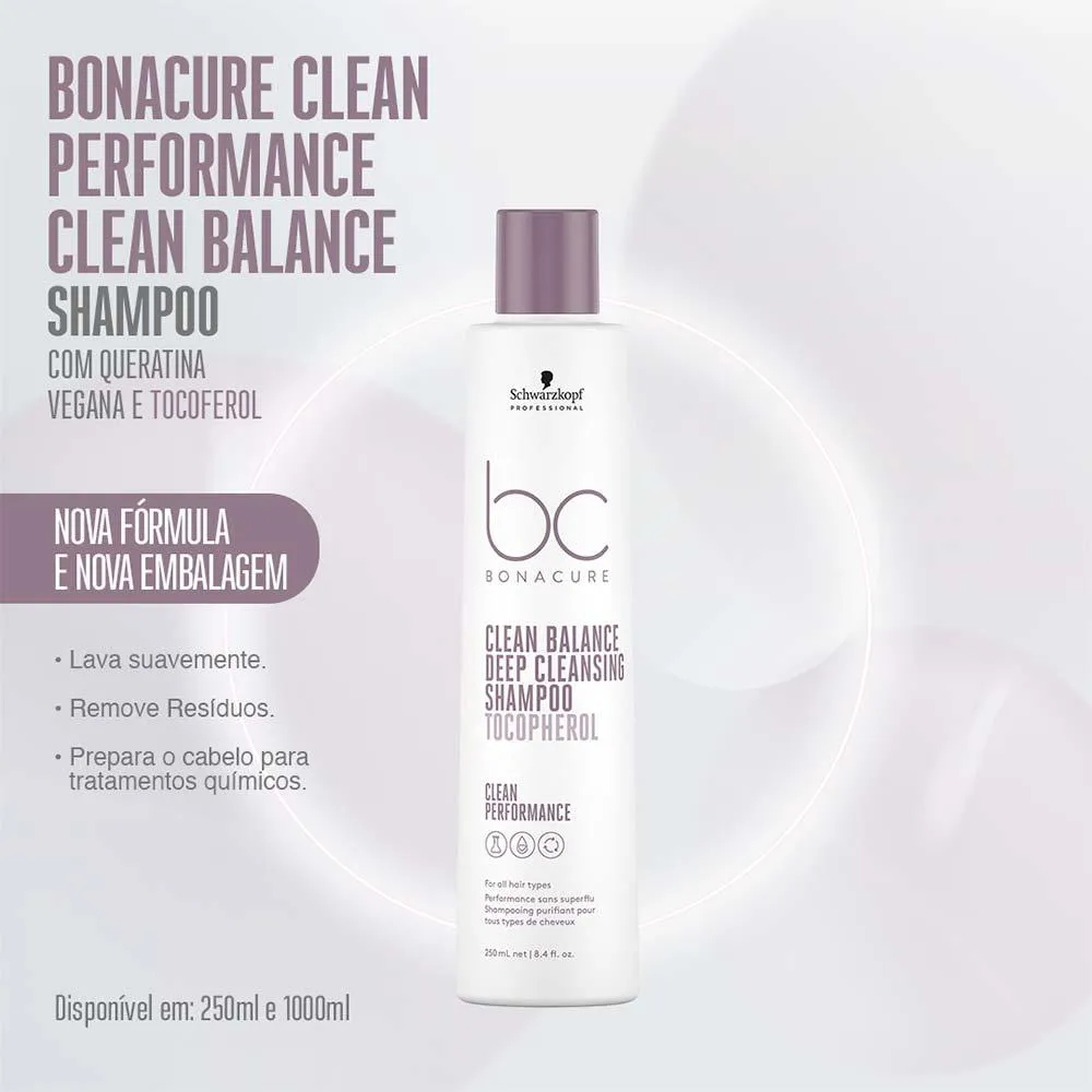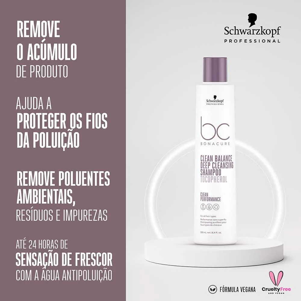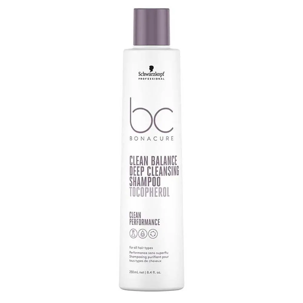 O Schwarzkopf Bc Clean Performance Balance Deep Cleansing é um shampoo suave de limpeza desenvolvido para todos os tipos de cabelo. Sua fórmula contém Tocoferol e foi criada para limpar efetivamente, eliminando o acúmulo de produtos e resíduos, além de preparar os fios para processos químicos. Serve para realizar uma limpeza profunda e delicada dos cabelos, removendo impurezas, proporcionando leveza, frescor e hidratação aos fios, garantindo um toque macio e mais vida ao cabelo.