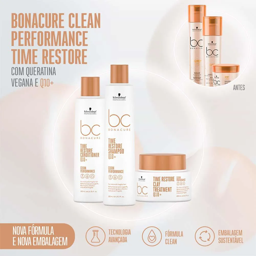 Bonacure Clean Performance: Tecnologia Avançada (queratina vegana e equalizador de células, que trata o cabelo de dentro pra fora), ingredientes de alta performance de skincare em sua fórmula limpa (sem sulfatos, corantes artificiais, silicones, parabenos, óleos minerais e microplásticos), além de ter a embalagem reciclável e feita de até 97% de plástico reciclado. Contém 6 sublinhas, uma para cada necessidade capilar: Repair Rescue (cabelos danificados), Color Freeze (cabelos coloridos), Moisture Kick (cabelos normais a secos, cacheados/ondulados), Volume Boost (cabelos finos), Q10 (cabelos maduros/enfraquecidos) e Clean Balance (todos os tipos de cabelos).