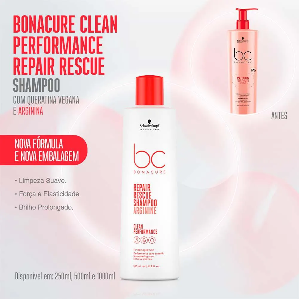 Bonacure Clean Performance: Tecnologia Avançada (queratina vegana e equalizador de células, que trata o cabelo de dentro pra fora), ingredientes de alta performance de skincare em sua fórmula limpa (sem sulfatos, corantes artificiais, silicones, parabenos, óleos minerais e microplásticos), além de ter a embalagem reciclável e feita de até 97% de plástico reciclado. Contém 6 sublinhas, uma para cada necessidade capilar: Repair Rescue (cabelos danificados), Color Freeze (cabelos coloridos), Moisture Kick (cabelos normais a secos, cacheados/ondulados), Volume Boost (cabelos finos), Q10 (cabelos maduros/enfraquecidos) e Clean Balance (todos os tipos de cabelos).