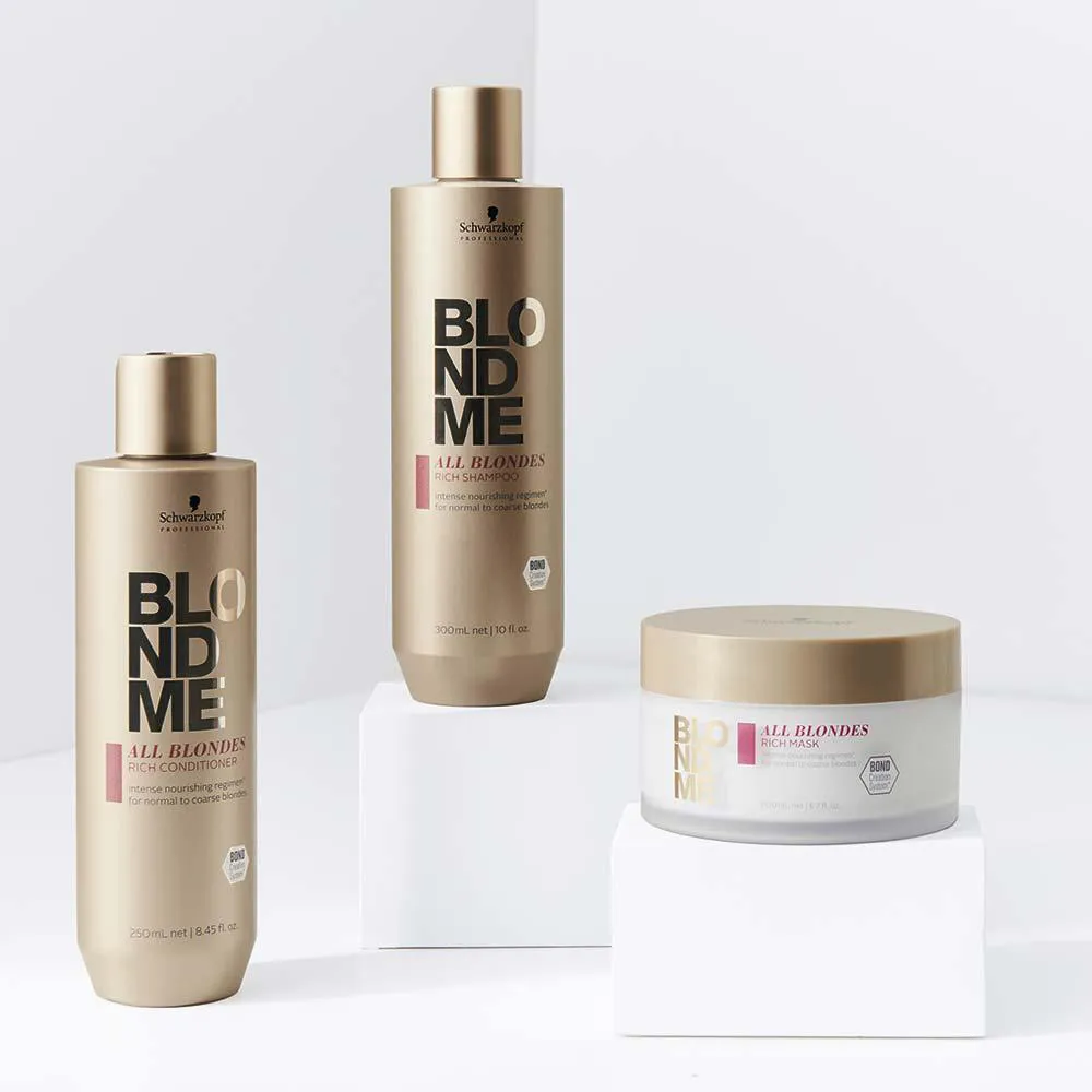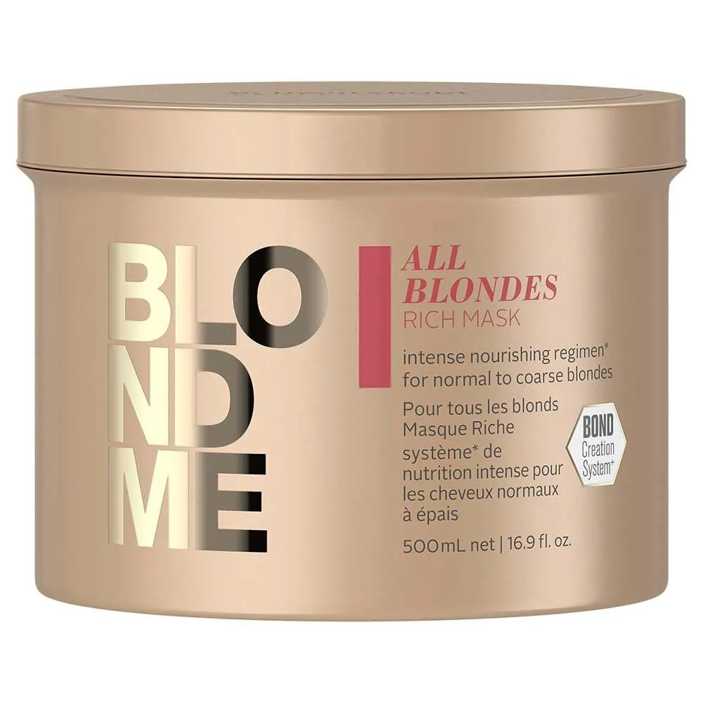 A Máscara Capilar Schwarzkopf Professional BlondMe All Blondes Rich traz o Complexo de Proteína de Caxemira, a Tecnologia Bond Creation 3D e o Óleo de Marula, para nutrir profundamente o cabelo loiro normal ou espesso, além de ajudar a criar novas pontes. Proporciona maleabilidade e força e fortalece a estrutura capilar interna em até 93% - quando usado em conjunto com o shampoo Enriquecido.