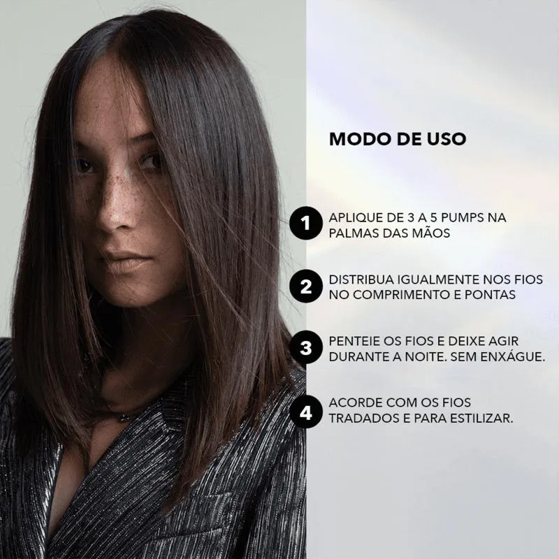 Modo de Aplicação: Aplique 2-5 pumps nas palmas das mãos e distribua uniformemente nos comprimentos e pontas de cabelos secos ou úmidos. Escove para finalizar e deixe agir durante a noite, sem enxaguar. Pela manhã, lave normalmente ou reaplique após o shampoo para uso diário.