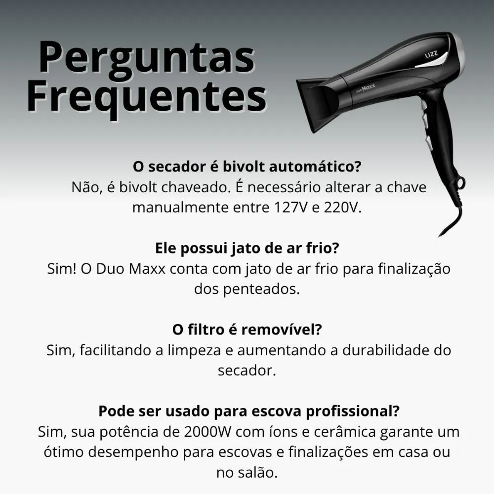 O Secador de Cabelos Duo Maxx é a escolha ideal para quem busca praticidade, desempenho e cuidado com os fios. Com potência de até 2000W, ele oferece 6 combinações de temperatura e velocidade, adaptando-se a diferentes tipos de cabelo e finalizações. Seu diferencial está nas tecnologias avançadas, como a ÍON Ceramic, que combina cerâmica com emissão de íons negativos, mantendo a hidratação natural dos fios, promovendo brilho, maciez e ajudando no controle do frizz. Conta ainda com jato de ar frio, filtro removível para facilitar a limpeza, além de ser bivolt chaveado, ideal para quem precisa de praticidade em qualquer lugar. . Benefícios: