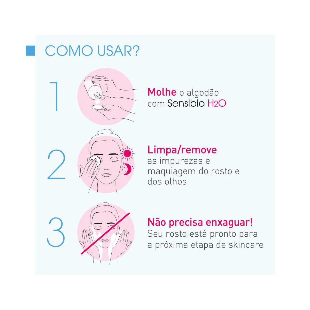 De manhã e/ou à noite, todos os dias. Não é necessário enxaguar. Molhe um algodão com Sensibio H2O Solução Micelar. Aplicar o algodão no rosto, limpando suavemente para higiene do rosto ou remoção da maquiagem. Repetir até que o algodão fique limpo; Secar o rosto suavemente com uma toalha de algodão.