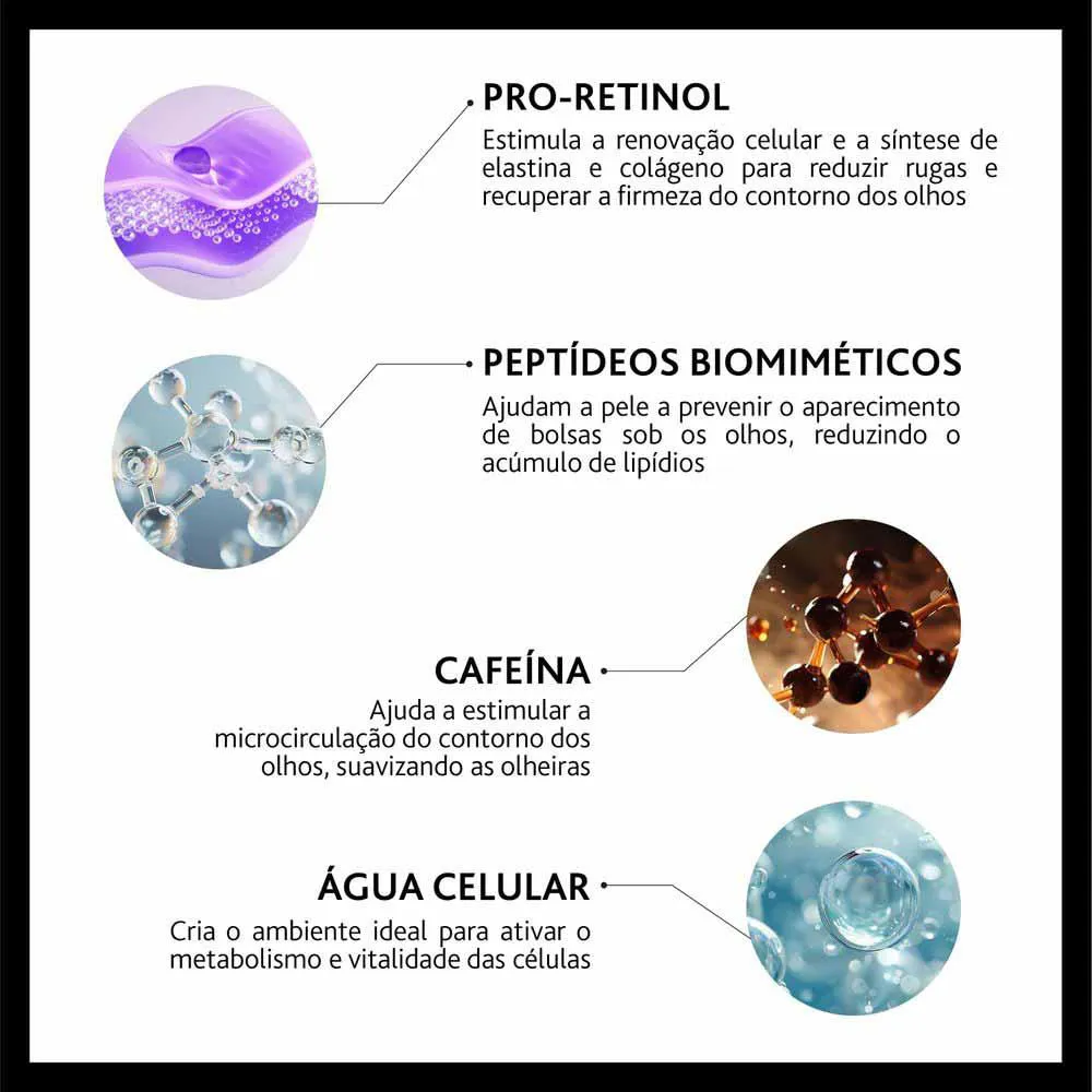 As rugas do contorno dos olhos são suavizadas. A região é hidratada intensamente e a parte funda das olheiras ganha volume. O olhar fica iluminado e visivelmente revigorado. Textura aqua-gel, com acabamento leve e não oleoso. Aplicar na região ao redor dos olhos pela manhã e/ou a noite.