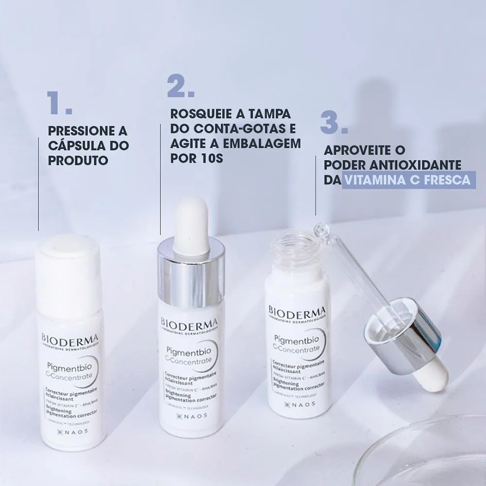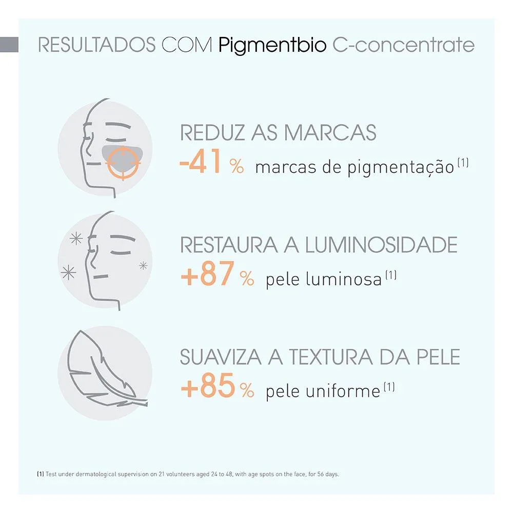 O sérum concentrado clareador e antioxidante Pigmentbio C Concentrate ilumina, corrige e uniformiza a tonalidade da pele. Fórmula com combinação inédita de potentes ativos clareadores à vitamina c fresca: