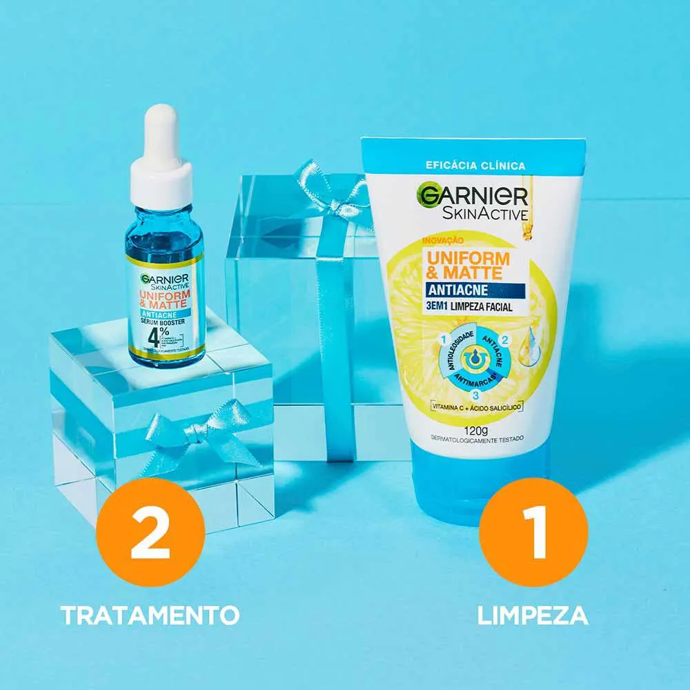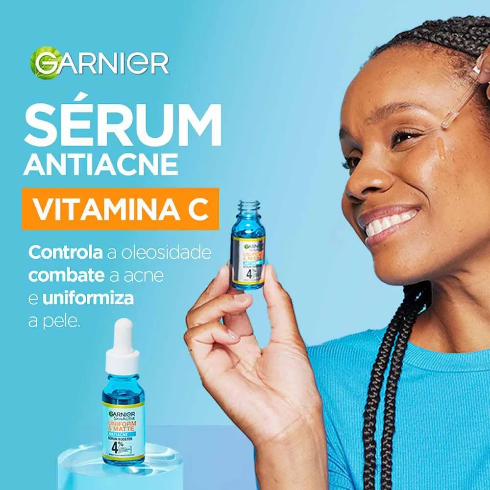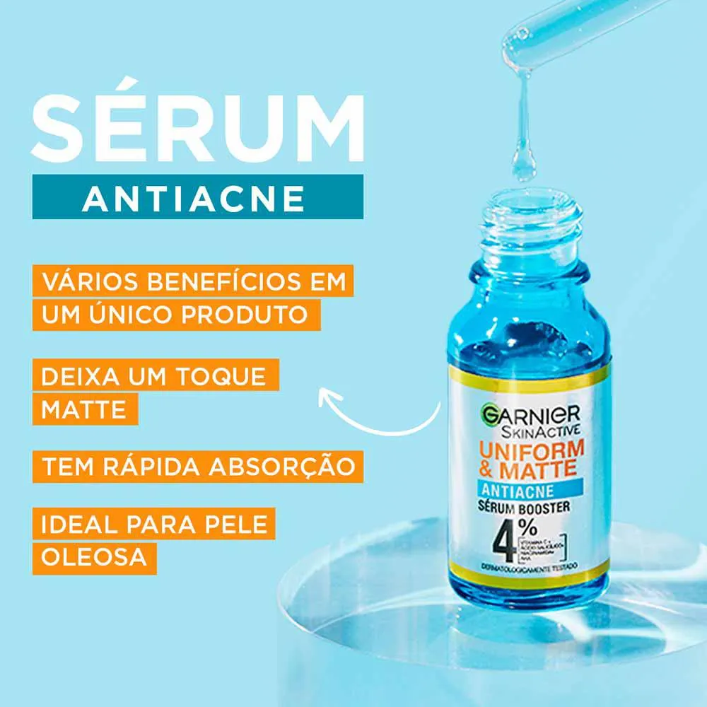 O novo Garnier Uniform & Matte antiacne Sérum Booster é um sérum antiacne e antimarcas de uso diário.