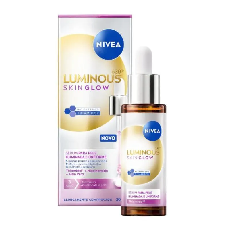 O Nivea Luminous630 Skin Glow é um sérum facial desenvolvido para quem busca uma pele com brilho natural, uniforme e saudável. Sua fórmula potente, enriquecida com Thiamidol, Niacinamida e Aloe Vera, atua em três dimensões: reduz manchas, diminui poros dilatados e hidrata profundamente. Além disso, promove uma sensação refrescante imediata e pode ser usado como primer antes da maquiagem.