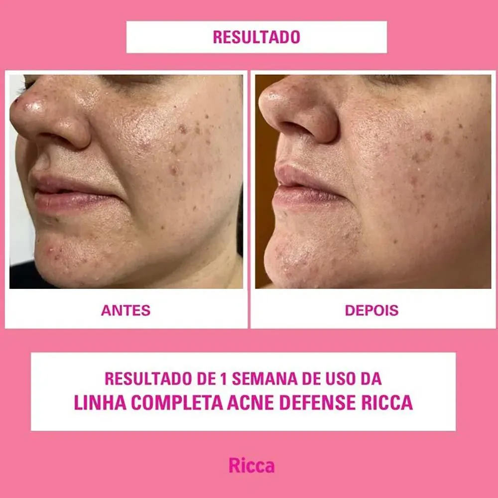 O Sérum da linha acne Defense Ricca tem ótima concentração de niacinamida, que é um composto que hidrata, ilumina e reduz manchas da derme.