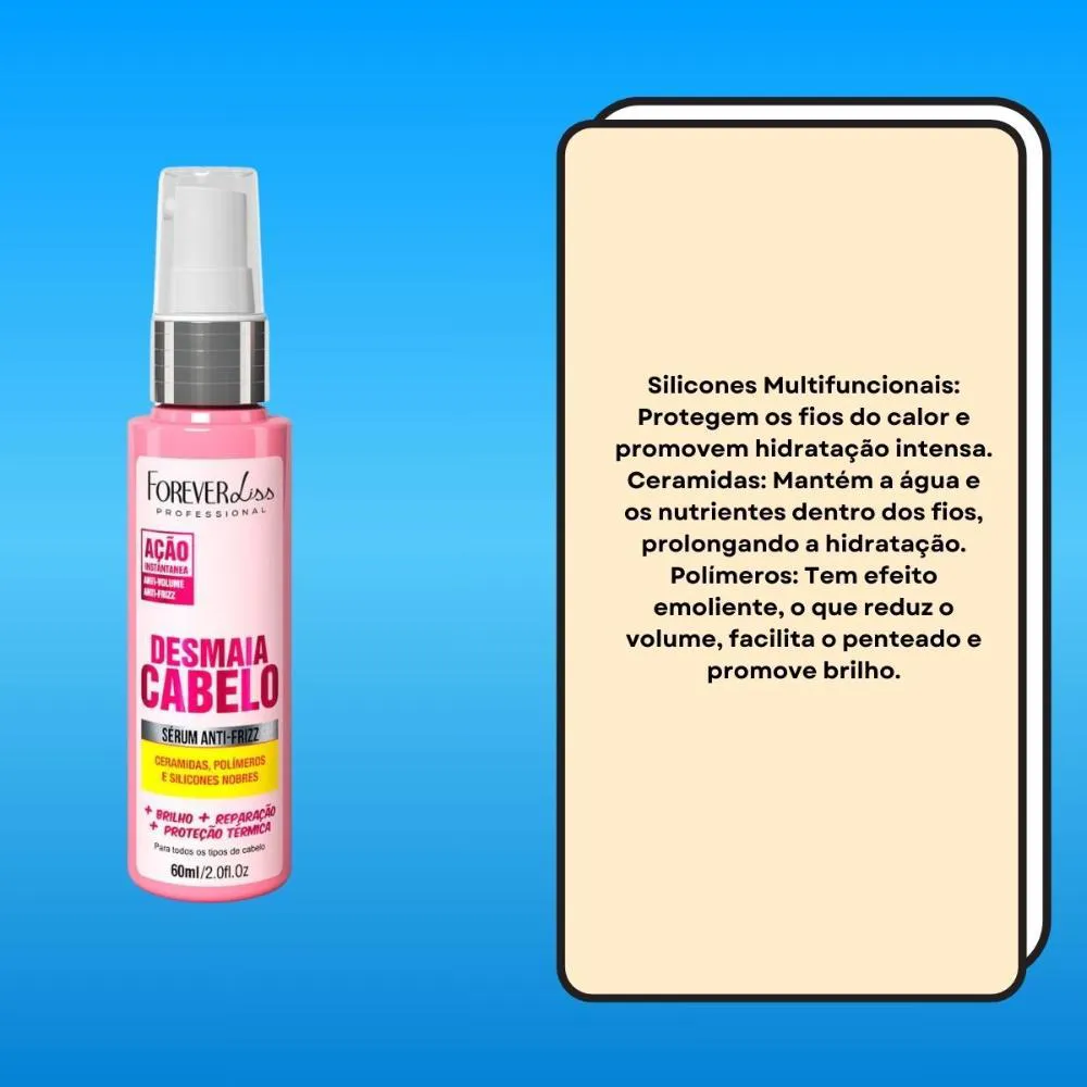 shampoo Forever Liss Desmaia Cabelo: para iniciar a rotina com limpeza que respeita os fios. - Máscara Forever Liss Desmaia Cabelo: para potencializar disciplina e maciez no comprimento. - Finalizador Forever Liss Desmaia Cabelo: para ajudar a alinhar e proteger na finalização.
