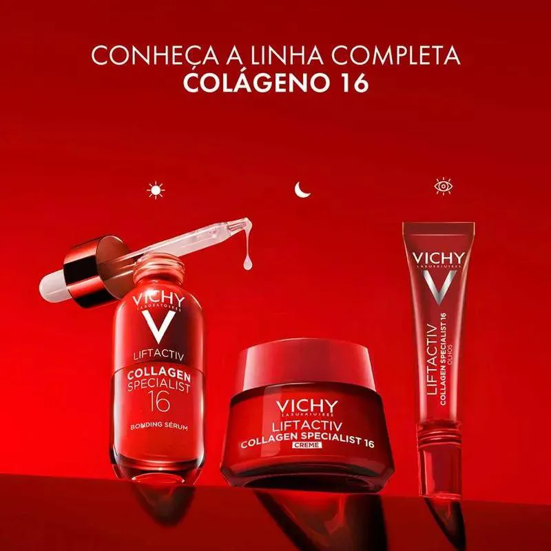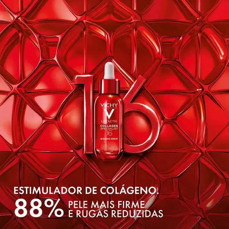 O Vichy Liftactiv Collagen Specialist 16 é um sérum facial de alta performance inspirado em procedimentos dermatológicos que atua nos sinais visíveis da perda de colágeno. Sua fórmula inovadora com 16% de ativos dermatológicos oferece firmeza, preenchimento e luminosidade visíveis. Ativos de alta eficácia:- Vitamina Cg: poderoso antioxidante que ilumina e uniformiza o tom