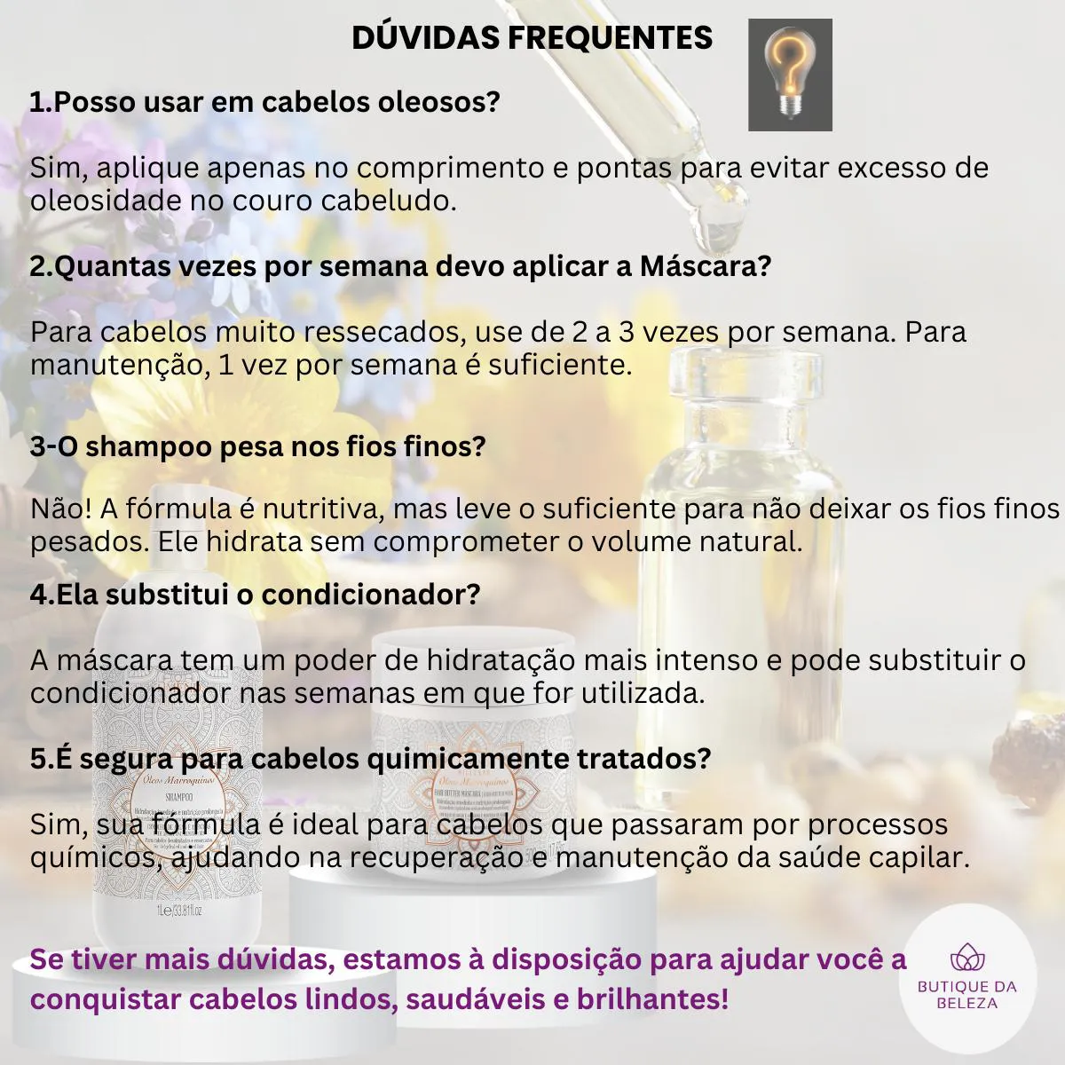 SERVIR E AJUDAR SÃO NOSSOS DEVERES O kit Amend Óleos Marroquinos, composto por Shampoo 1000ml e Máscara Capilar de 500g é a solução perfeita para cabelos secos, danificados, opacos e com frizz. Enriquecida com óleos preciosos de argan e amêndoas, oferece nutrição avançada, hidratação intensa e recuperação da saúde capilar desde a primeira aplicação. INDICADO PARA QUAL TIPO DE cabelo Cabelos secos, danificados ou opacos, que precisam de hidratação e nutrição intensiva. Cabelos com frizz, que necessitam de alinhamento e controle. Fios quebradiços ou quimicamente tratados, que demandam reparação e fortalecimento. BENEFÍCIOS Nutrição Profunda: Hidrata e revitaliza os fios com óleos ricos em vitaminas e ácidos graxos. Hidratação Duradoura: Reabastece a umidade, proporcionando fios macios e sedosos. Controle do Frizz: Sela as cutículas, deixando os cabelos alinhados e disciplinados. Reparação e Fortalecimento: Recupera a elasticidade e a força dos fios, prevenindo a quebra. Brilho Saudável: Realça a luminosidade natural, deixando os cabelos radiantes. Proteção Contra Danos: Forma uma barreira contra agressões externas, como poluição e calor. RESULTADOS Cabelos hidratados, macios, livres de frizz e com brilho deslumbrante. A máscara oferece um tratamento intensivo, restaurando a vitalidade dos fios ao longo do tempo. MODO DE USO 1. Shampoo Profissional Amend Óleos Marroquinos: Aplique nos cabelos molhados, massageie suavemente até formar espuma e enxágue bem. Repita, se necessário.