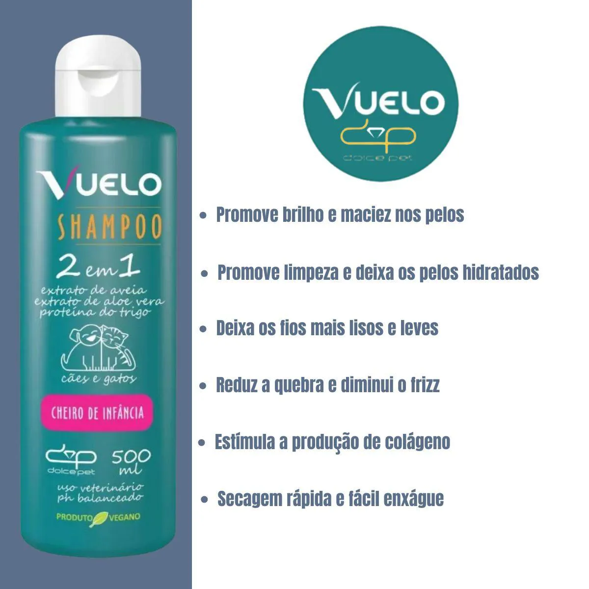shampoo 2 em 1 Vuelo para Cães e Gatos O Shampoo 2 em 1 Vuelo foi desenvolvido para oferecer limpeza eficiente e hidratação em um único produto, deixando os pelos do seu pet macios, brilhantes e saudáveis desde o primeiro uso. Sua fórmula conta com Extrato de Aloe Vera, que promove limpeza profunda e auxilia na estimulação da produção de colágeno.