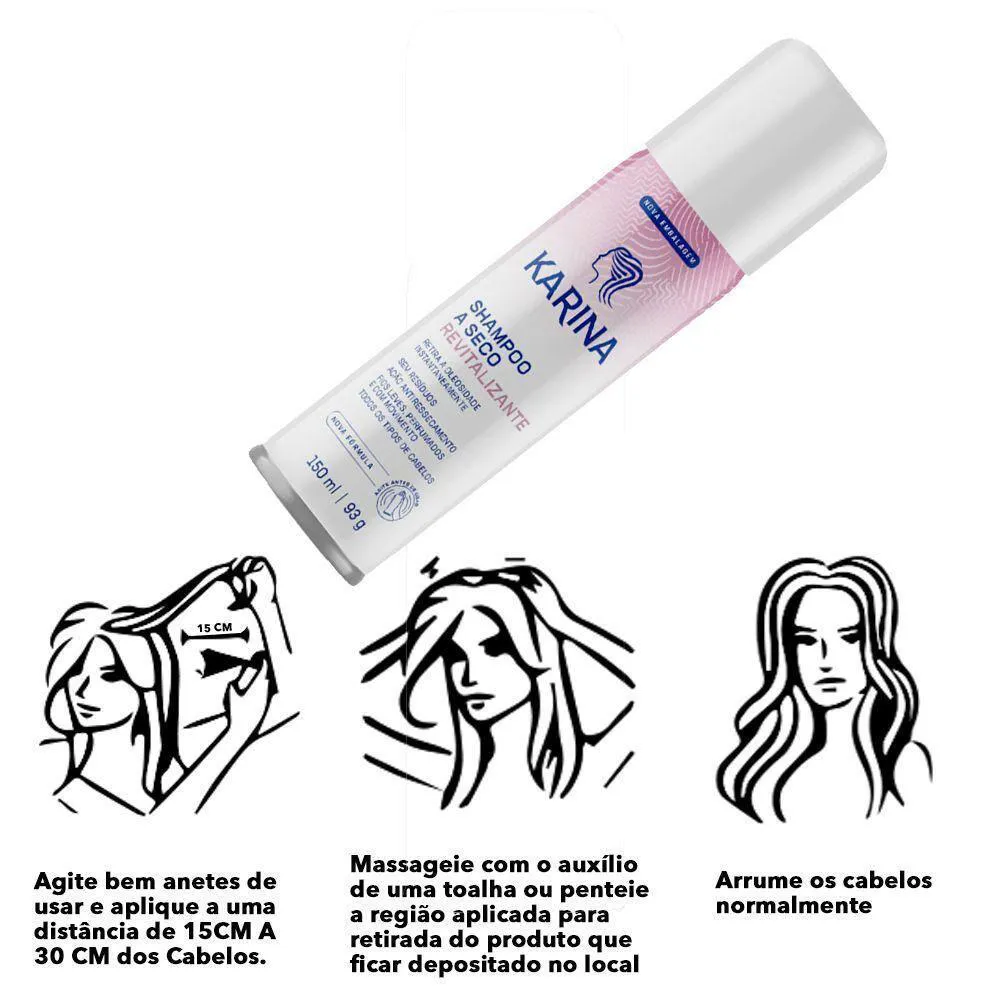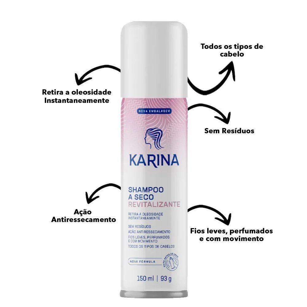shampoo A SECO KARINA aerosol 150ML REVITALIZANTE Cabelos revitalizados, limpos e perfumados. Fórmula com Aminotech que evita ressecamento. Mantém o brilho natural dos cabelos. Indicado para todos os tipos de cabelo. Fios leves e macios, com movimento e brilho.