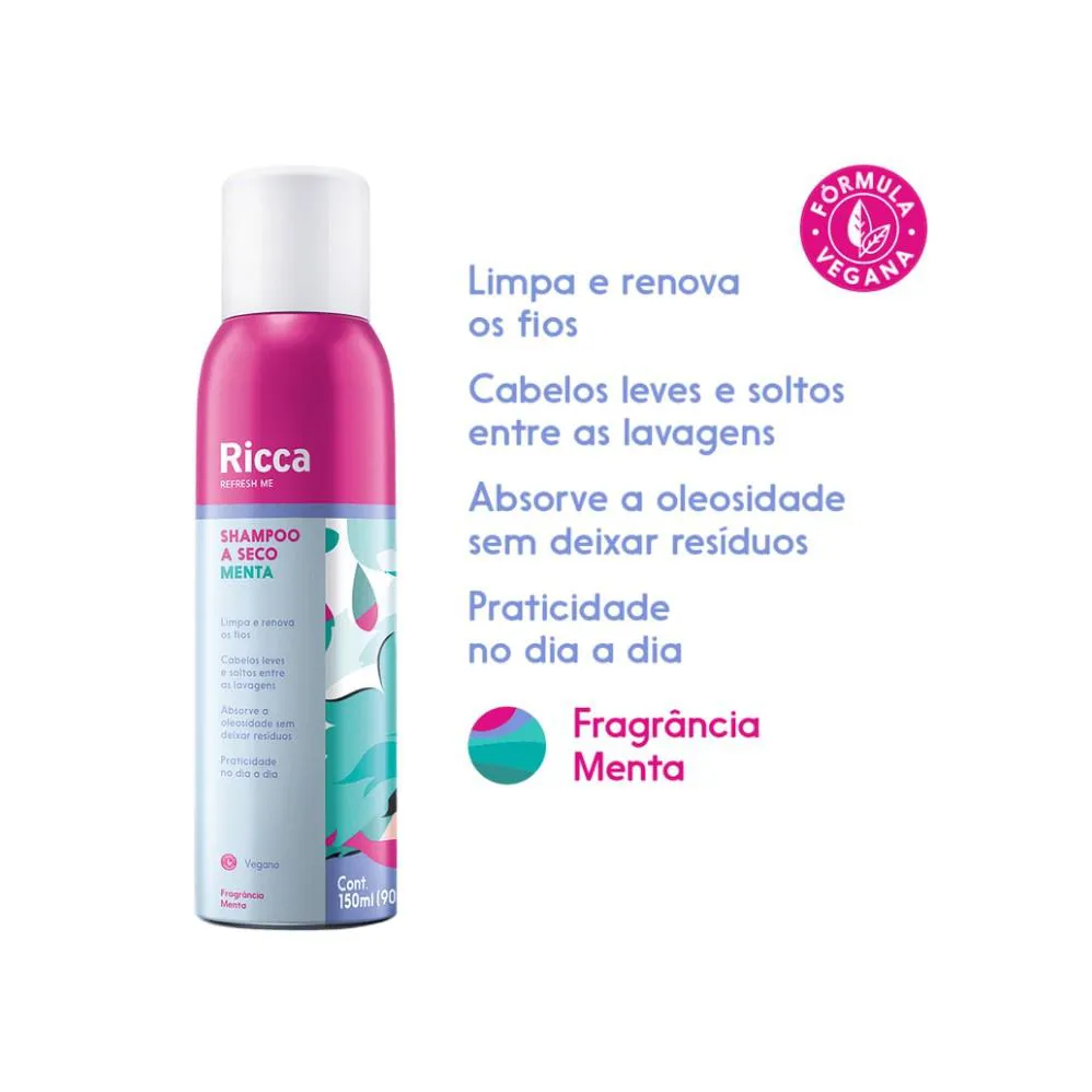 shampoo A SECO MENTA 50ML RICCA O Shampoo a Seco Menta é o seu aliado ideal para aqueles dias corridos! Ele absorve instantaneamente a oleosidade e devolve o volume à raiz, proporcionando um efeito "acabei de sair do banho". Ele limpa e renova o visual, deixando os fios leves, soltos e com um irresistível cheirinho refrescante de menta. É o toque final que você precisa para estar sempre radiante, mesmo quando não há tempo de lavar os cabelos. BENEFICIOS: Absorve a oleosidade sem deixar resíduos Limpa e renova os fios cabelo leve e solto entre as lavagens Praticidade no dia a dia Como usar shampoo a seco? O shampoo a seco deve ser aplicado onde a oleosidade é mais intensa, principalmente nas laterais e no topo da cabeça. Veja o passo a passo abaixo: Divida o cabelo em mechas. Agite o produto por cerca de 10 segundos. Aplique o produto nas áreas mais oleosas a uma distância de 30 cm. Deixe agir por alguns segundos. Faça massagens no couro cabeludo espalhando o shampoo a seco. Finalize escovando os fios para remover todo o excesso de produto. AVISA 25351.336104/2019-19