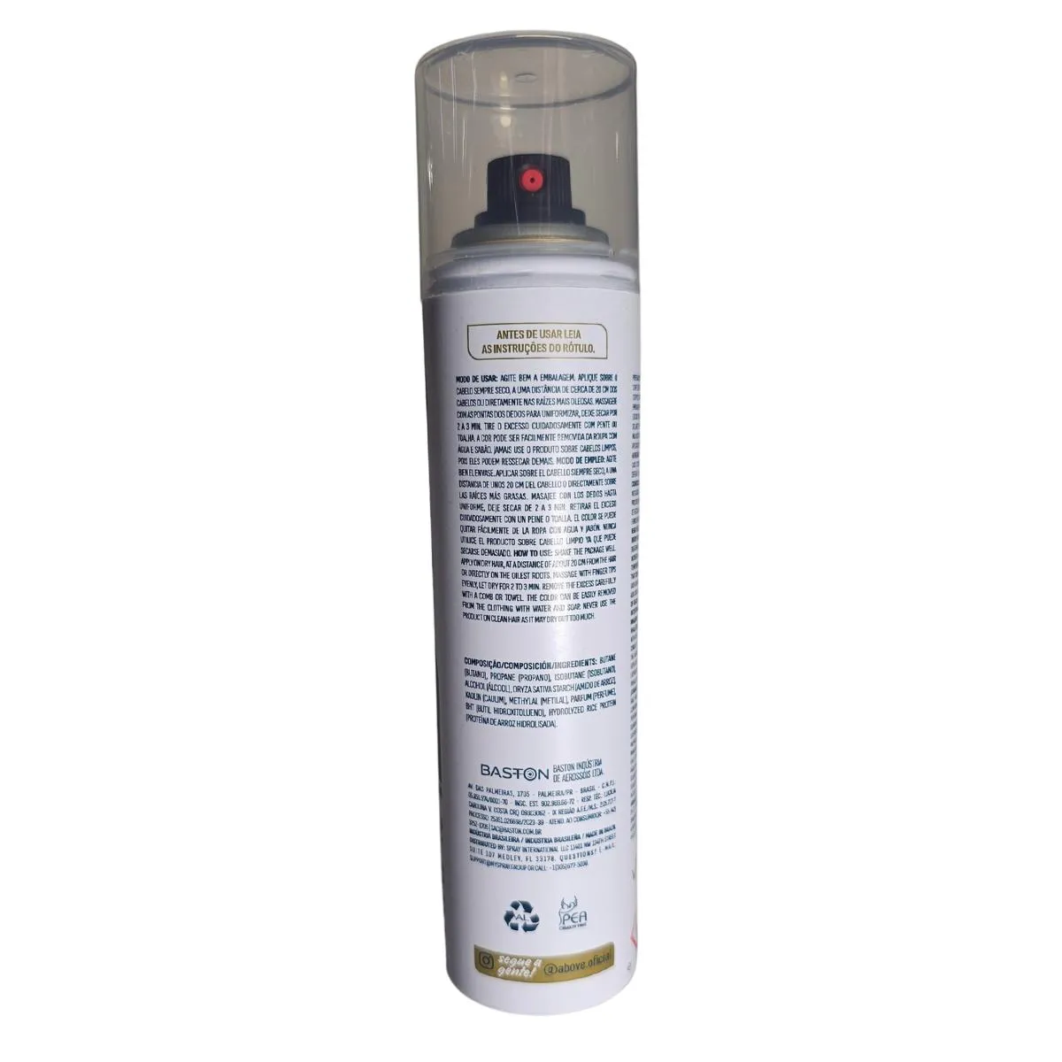 Composição: butane (butano), propane (propano), isobutane (isobutano), alcohol (álcool), bht (bht), oryza stiva starch (amido de arroz), kaolin (caulim), methylal (metilal), parfum (parfum), BHT (butil hidroxitolueno), hidrolyzed rice protein (proteína de arroz hidrolizada).