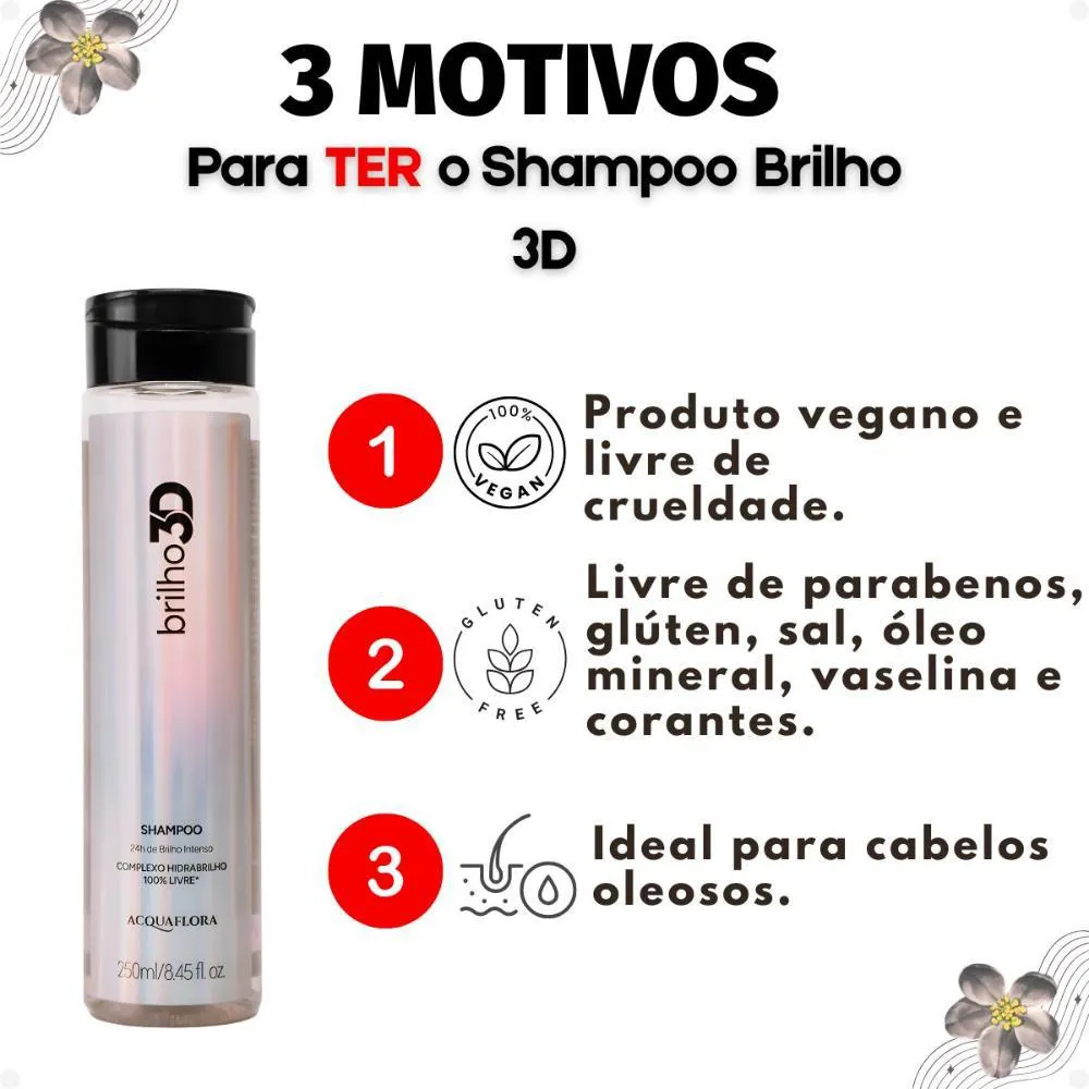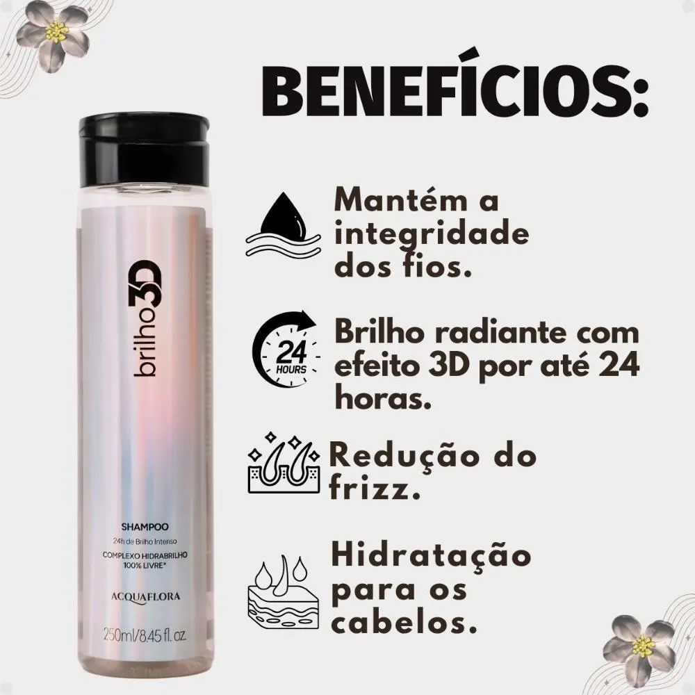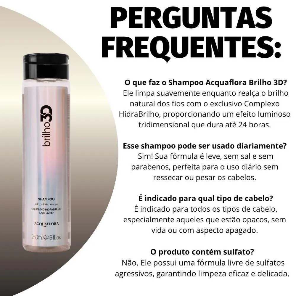 O Shampoo Acquaflora Brilho 3D 250ml é a escolha perfeita para quem busca cabelos com brilho intenso e vitalidade. Desenvolvido pela Acquaflora, este shampoo promove uma limpeza suave, enquanto seus ativos de alto poder de penetração na fibra capilar garantem leveza e um brilho radiante que dura até 24 horas. Ideal para cabelos