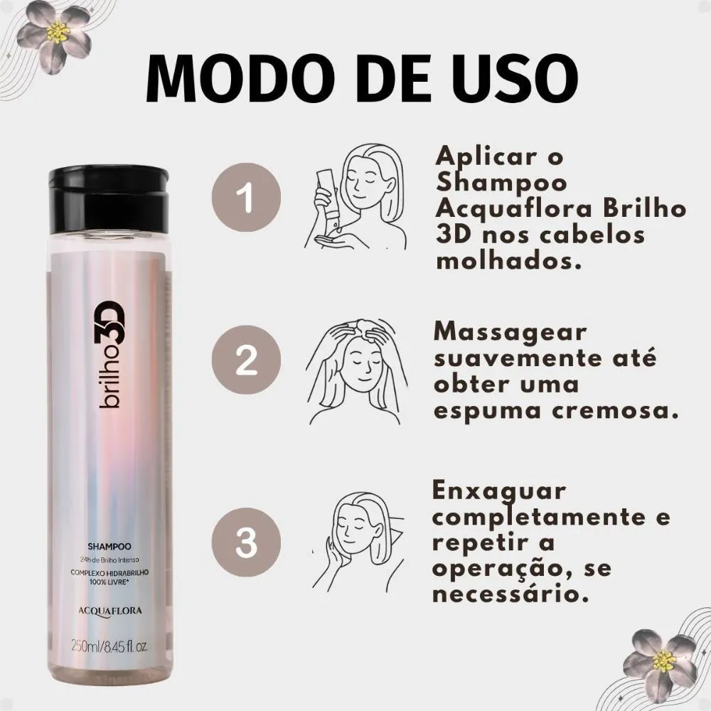 Aplicar o Shampoo Acquaflora Brilho 3D nos cabelos molhados.Massagear suavemente até obter uma espuma cremosa.Enxaguar completamente e repetir a operação, se necessário.Para resultados otimizados, utilize a linha completa Acquaflora Brilho 3D. Anvisa: Código de Registro Sanitário (ANVISA)