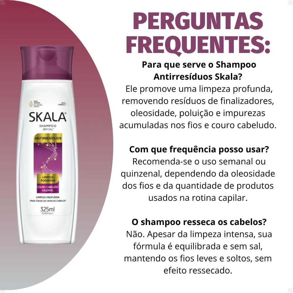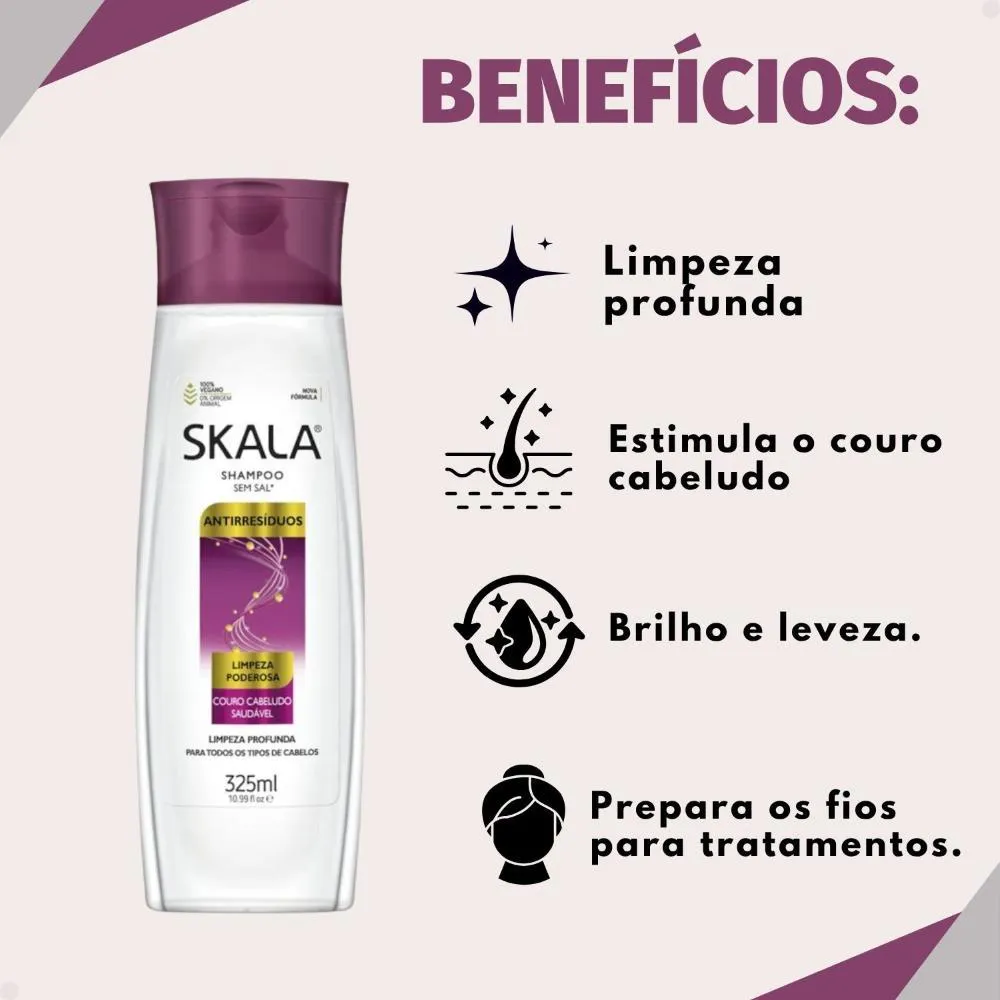 Descubra o poder de uma limpeza revitalizante com o Shampoo Antirresíduos Skala Limpeza Poderosa 325ml. Formulado para remover eficazmente o acúmulo de resíduos de produtos, oleosidade e impurezas que se depositam nos fios ao longo do tempo, este shampoo promove uma desintoxicação capilar completa. Prepare seus cabelos para absorver tratamentos e sinta a leveza e o brilho renovados. Ideal para todos os tipos de cabelo que necessitam de uma limpeza profunda sem ressecar.Benefícios Principais
