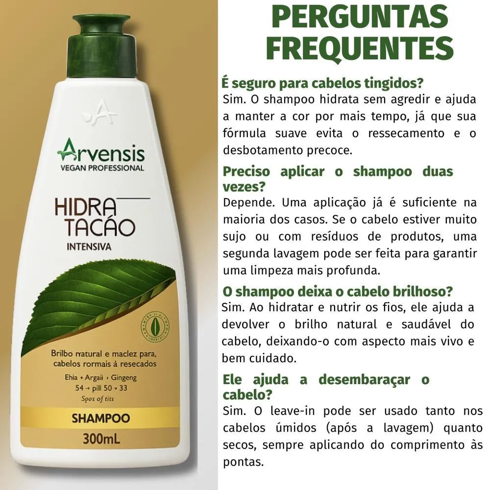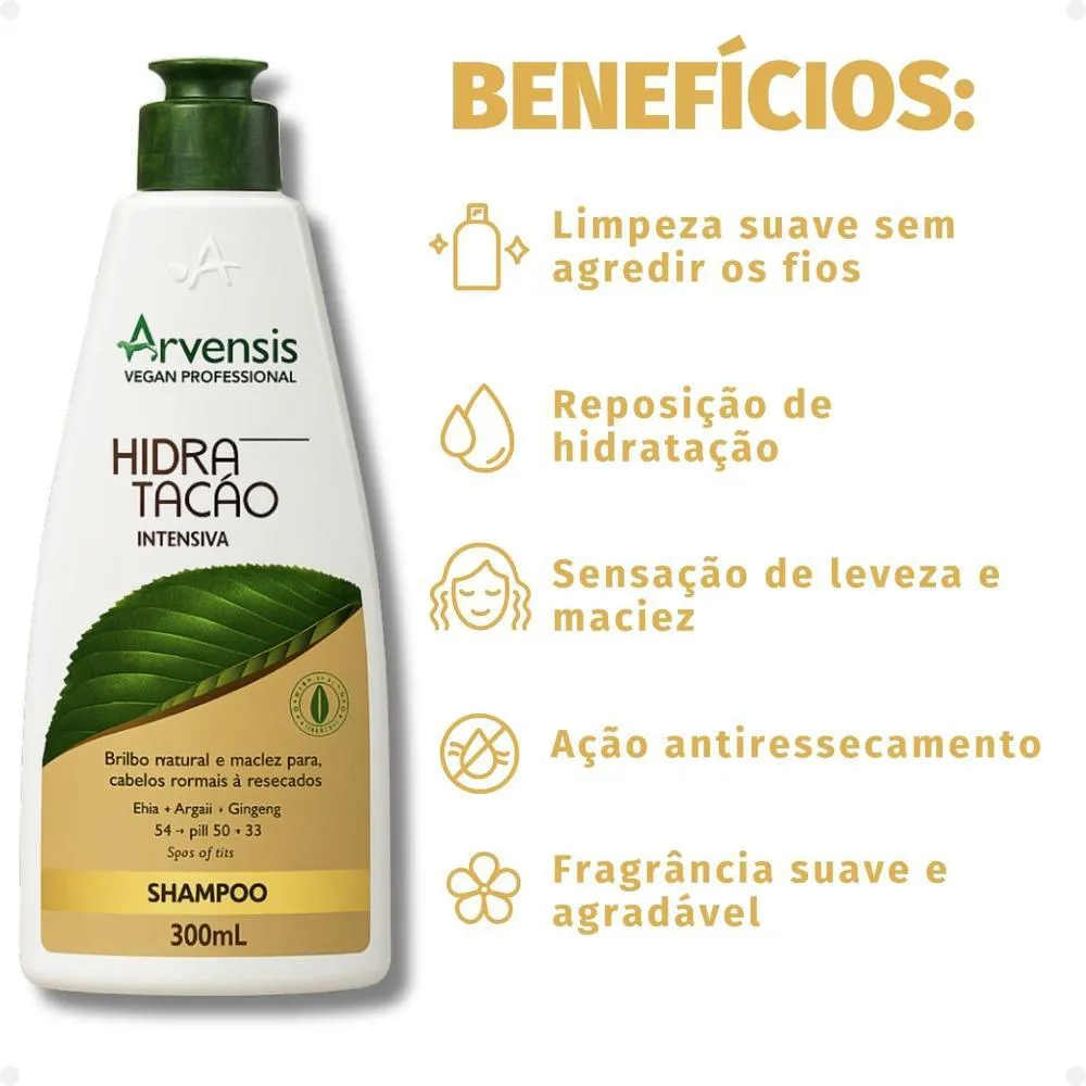 shampoo Arvensis Hidratação Intensiva 300ml O Shampoo Arvensis Hidratação Intensiva é a escolha ideal para quem busca unir limpeza eficiente a um tratamento de hidratação profunda logo na primeira etapa do cuidado capilar. Desenvolvido especialmente para cabelos ressecados, sem brilho e com toque áspero, sua fórmula balanceada remove as impurezas sem comprometer a umidade natural dos fios. Enriquecido com ativos emolientes e nutrientes hidratantes, o shampoo ajuda a restaurar o equilíbrio hídrico da fibra capilar, combatendo o ressecamento e preparando o cabelo para os próximos passos da rotina de tratamento. A textura suave e o pH equilibrado garantem conforto ao couro cabeludo e evitam agressões à estrutura dos fios. Com o uso contínuo, os cabelos ficam visivelmente mais saudáveis, sedosos e revitalizados — com brilho natural, leveza e movimento. .