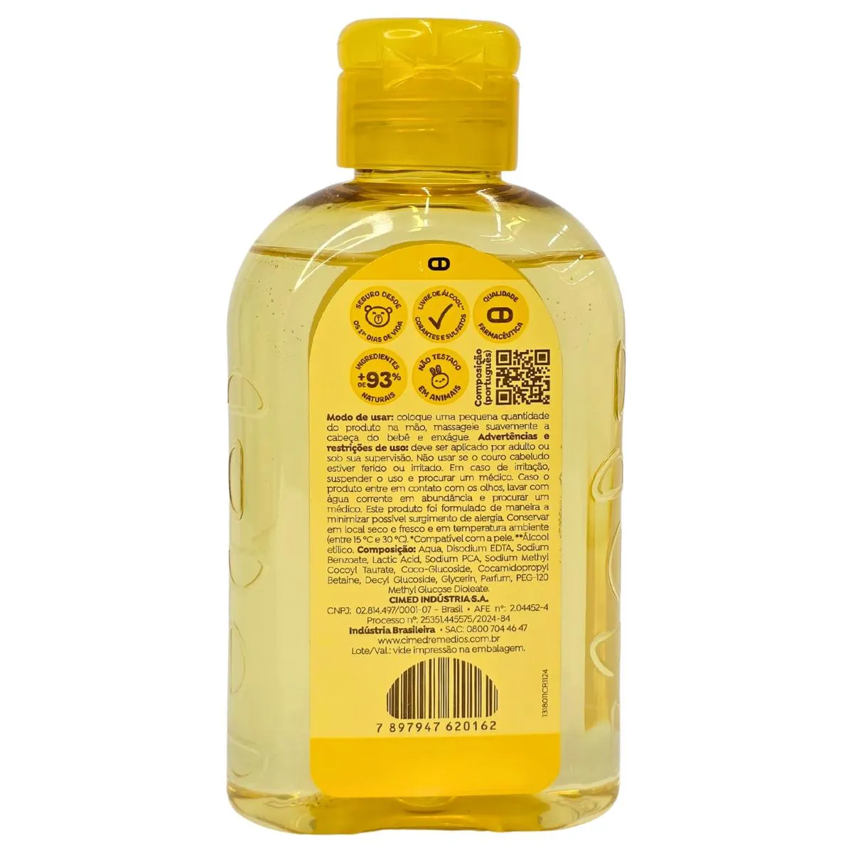 Modo de Uso: Coloque uma pequena quantidade do produto na mão, massageie suavemente a cabeça do bebê e enxágue.