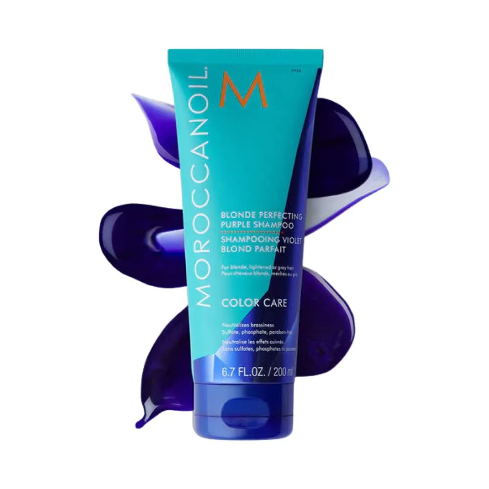 O shampoo Blonde Perfecting Purple Color Care da Moroccanoil foi desenvolvido especialmente para cabelos loiros, castanhos clareados e grisalhos. Sua fórmula profissional com pigmentos violeta ajuda a neutralizar os tons amarelados e alaranjados indesejados, mantendo a cor mais luminosa, equilibrada e radiante entre as visitas ao salão. Com limpeza suave e eficaz, o shampoo remove impurezas sem ressecar os fios, preservando a saúde da fibra capilar e a intensidade da cor. A fórmula conta com a tecnologia ArganID™, que auxilia na reparação do cabelo de dentro para fora, enquanto o óleo de argan nutre profundamente e promove maciez, brilho e hidratação. Livre de sulfatos, fosfatos e parabenos, é seguro para cabelos coloridos e ideal para manter o loiro com aparência fresca, vibrante e saudável. Características