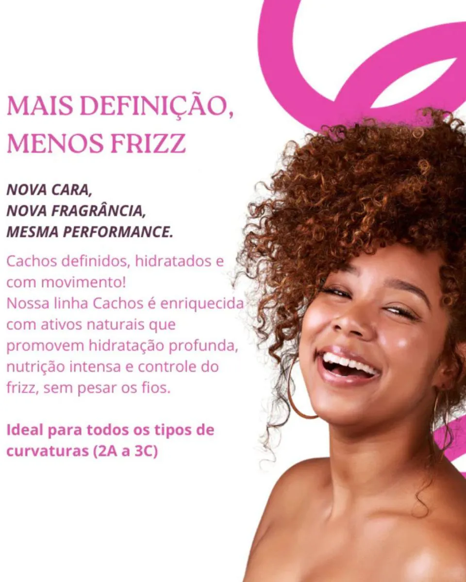 O shampoo Cachos higieniza os fios sem agredir o couro cabeludo, promovendo cachos limpos, leves, nutridos e macios desde a primeira lavagem. Ideal para manter o movimento natural da curvatura e cuidar da saúde do couro cabeludo com suavidade.