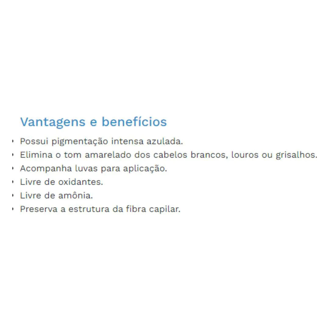 Possui pigmentação intensa azulada eliminando o amarelado dos fios, proporcionando cabelos brancos mais neutros e louros mais puros. O queridinho das mulheres que descolorem o cabelos e não desejam ficar com o tom amarelado nos fios.