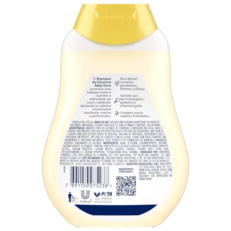 Descrição do produto:O Shampoo de Glicerina Baby Dove foi especialmente desenvolvido para cuidar do delicado couro cabeludo e cabelos do bebê desde o primeiro dia de vida. Sua fórmula hipoalergênica e suave ajuda a manter a hidratação natural e os nutrientes essenciais da pele do bebê, deixando os fios macios, saudáveis e fáceis de pentear. Com pH neutro e perfume especialmente desenvolvido para minimizar riscos de alergia, este shampoo limpa delicadamente sem irritar os olhos e protege a pele sensível do bebê.