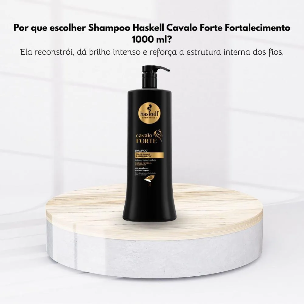 O Shampoo Haskell Cavalo Forte Fortalecimento 1000ml foi desenvolvido para fortalecer os fios desde a raiz, auxiliar no crescimento saudável e promover limpeza eficiente sem ressecar. Sua fórmula com biotina, pantenol e queratina vegetal ajuda a reduzir a quebra, aumentar a resistência e preparar o cabelo para o tratamento completo.Para Qual Tipo de Cabelo é Indicado?