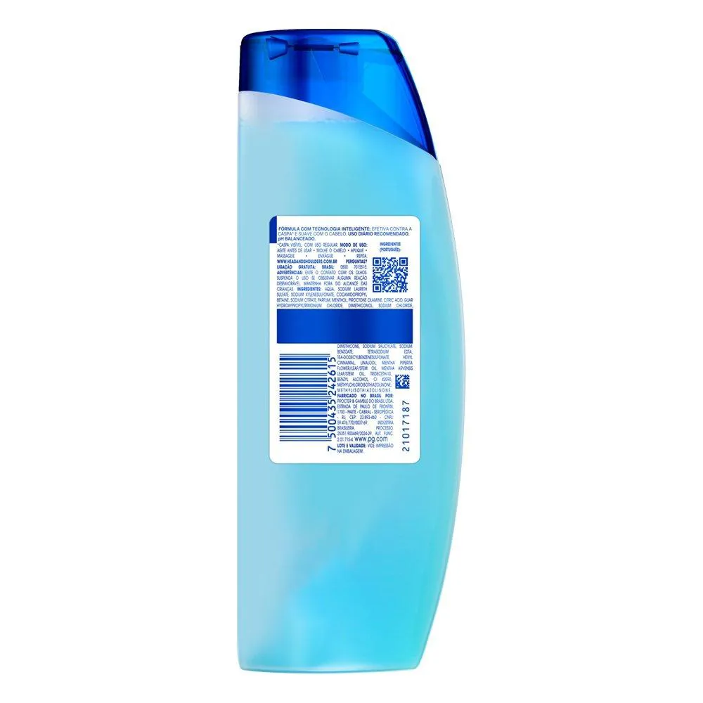 Água,sulfato de sódio laureth, sulfonato de xilenossódio, betaína de cocamidopropil, citrato de sódio, perfume, mentol, olamina piroctona, ácido cítrico, cloreto de guar-hidroxipropiltrimonio, dimeticonol, cloreto de sódio, dimeticona, salicilato de sódio, benzoato de sódio, EDTA tetrasódico, sulfonato de teadecilbenzeno, cinamal de hexilo, linalol, óleo de flor/folha/caule de hortelã-pimenta, óleo de folha/caule de hortelã-dos-prados, tridecete-10, álcool benzílico, CI 42090, metilcloroisotiazolinona, metilisotiazolinona.