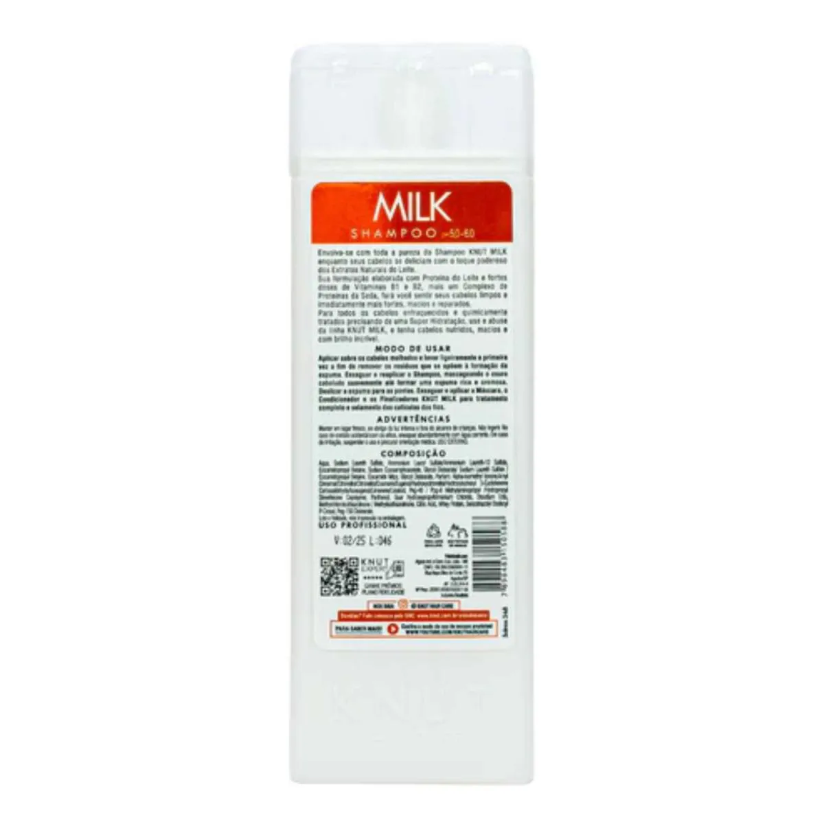 Shampoo para cabelos enfraquecidos ou quimicamente tratados. Knut Milk Shampoo hidrata intensamente e revitaliza os fios. Knut Milk Shampoo ajuda a promover uma reparação profunda enquanto melhora a resistência das áreas fragilizadas da fibra capilar.Assim, protege os fios das agressões diárias ou químicas futuras e deixa seu cabelo mais fortalecido, brilhante e macio. Extratos Naturais do Leite, Vitaminas B1 e B2, Pantenol e proteínas da Seda: possuem ação fortalecedora e hidratante, além de formar uma película protetora em torno do fio contra as agressões externas. Produto livre de parabenos e ftalatos. Não testado em animais. Seu cabelo limpo, fortalecido, hidratado e protegido contra danos. Conselho de Aplicação Aplique o shampoo sobre a raiz molhada e massageie suavemente para realizar uma limpeza inicial.