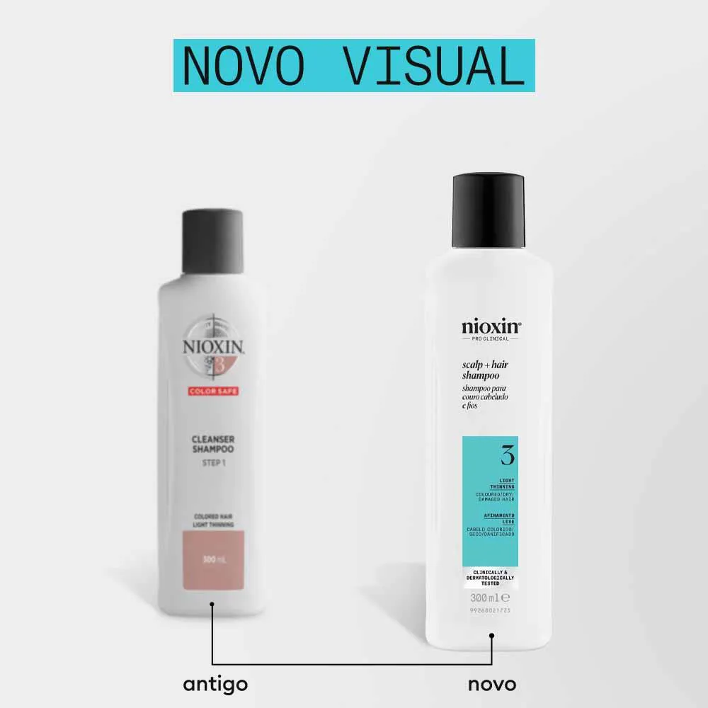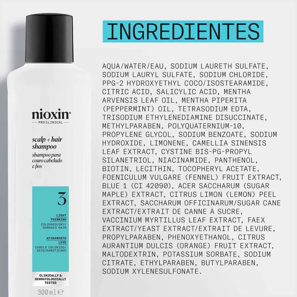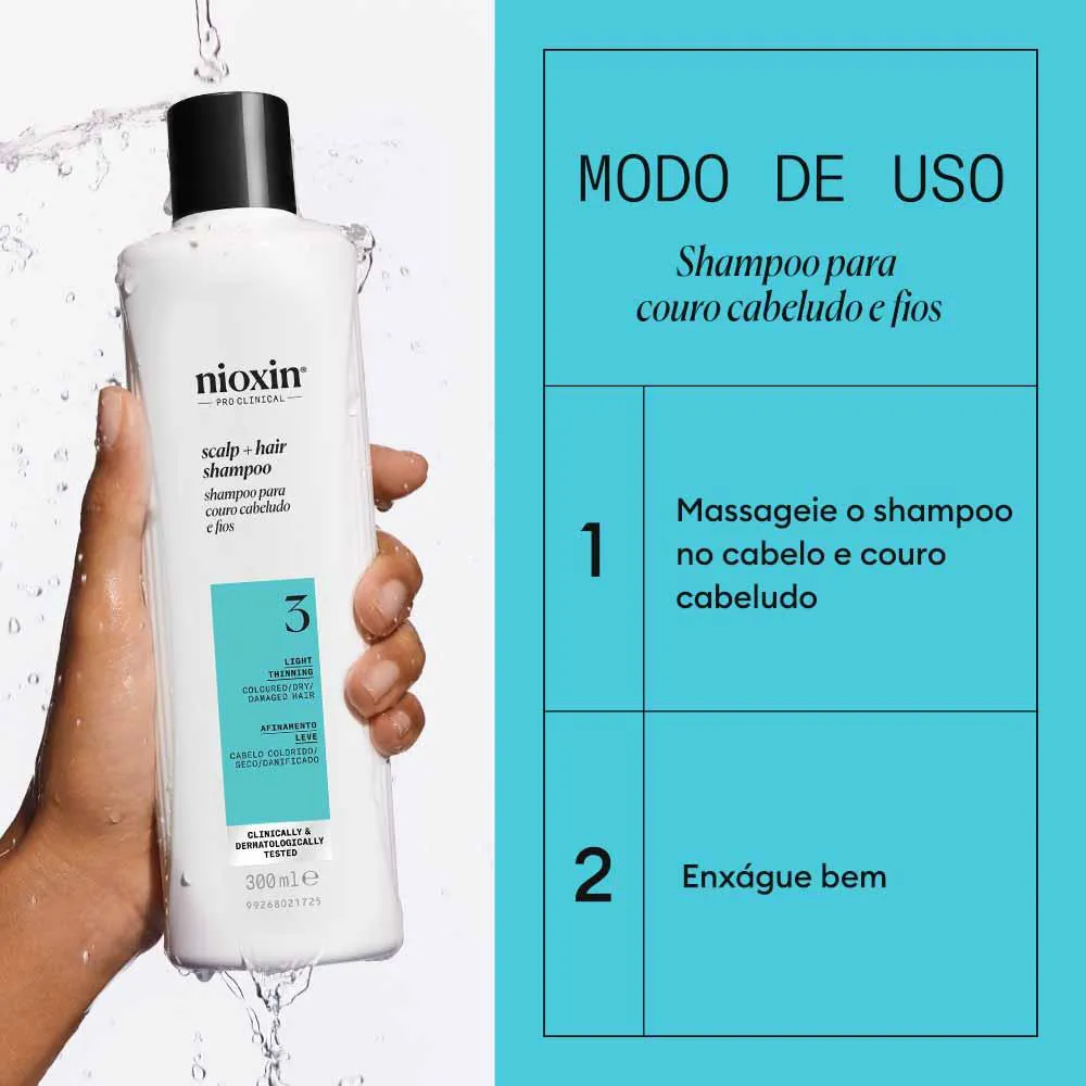 O Shampoo Nioxin System 3 é um produto capilar profissional desenvolvido para limpeza e tratamento de cabelos tingidos com afinamento leve. É um cleanser dermo-purificador que utiliza a tecnologia Glyco-Shield 2.0 para remover oleosidade, ácidos graxos e resíduos ambientais do couro cabeludo e dos cabelos.