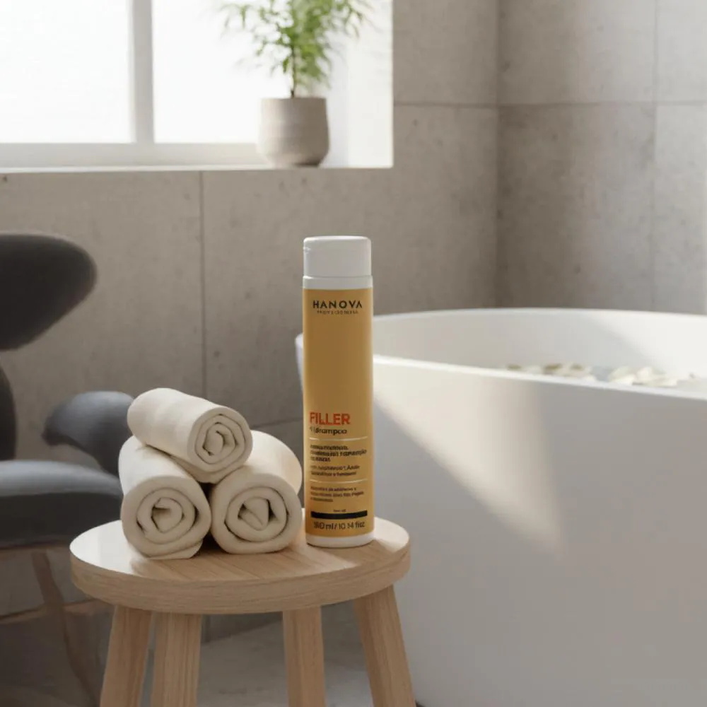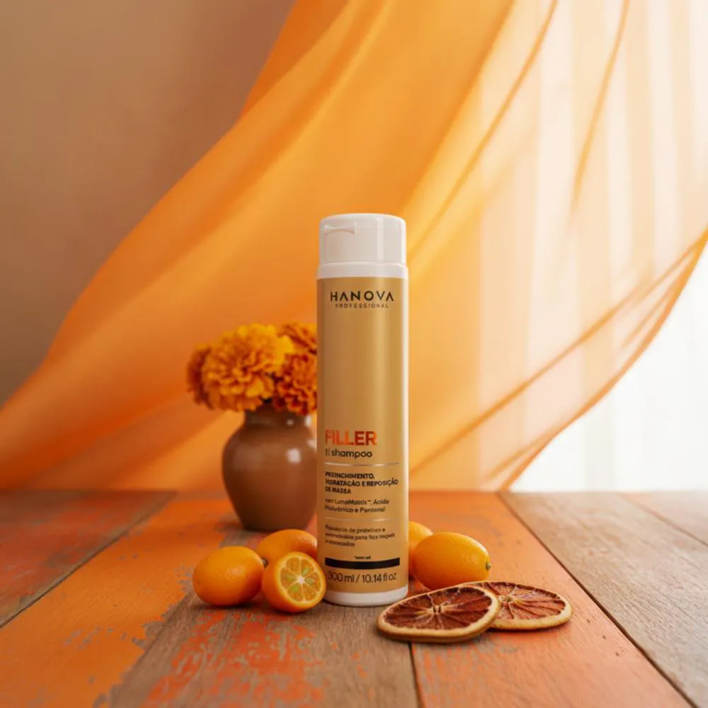 Hanova - shampoo Filler 300ml Proporciona volume e densidade para cabelos finos e fragilizados. Desenvolvido com Luna Matrix, ácido hialurônico e D-Pantenol, ele preenche a fibra capilar, devolvendo corpo, resistência e vitalidade sem perder a leveza. - Fios encorpados; - Repara danos profundos;- Cabelos fortes e resistêntes. Sujestão de uso:1 - Aplique o Shampoo Filler nos fios molhados, massageando bem o couro cabeludo;2 - Enxágue retirando totalmente o produto. O que você está comprando!01 - Shampoo Filler Hanova - 300ml. *Não testado em animais;*Imagens meramente ilustrativas.