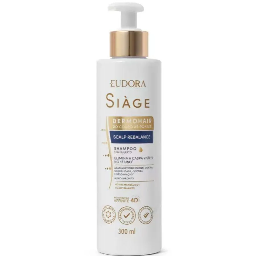 shampoo Siàge Dermo Hair Scalp Rebalance 300ml Você sofre com a caspa e os problemas do couro cabeludo? O Shampoo Siàge Dermo Hair Scalp Rebalance oferece um tratamento de alta performance, que reequilibra o microbioma do couro cabeludo irritado ou sensível. Promove uma limpeza que não resseca os fios e ainda deixa uma sensação de couro cabeludo hidratado e livre do desconforto. Como o Shampoo Siàge Dermo Hair Scalp Rebalance age? O shampoo age de forma multidimensional, combatendo a caspa, a oleosidade, a sensibilidade, a coceira e a descamação desde a primeira lavagem. Renova as células do couro cabeludo e melhora o microbioma da região através do tratamento com pré e probióticos presentes na fórmula. Quais são os benefícios? -Ação multidimensional: atua no combate à caspa, alivia a coceira, minimiza o desconforto e a vermelhidão, além de reduzir a descamação -Redução imediata da caspa visível e da coceira, logo na primeira aplicação -Dermatologicamente testado: 100% dos produtos da linha foram testados e aprovados por tricologistas brasileiros -Produto consciente: vegano, sem parabenos, sal, petrolato e corantes. Fragrância e extração de ingredientes de fontes éticas O que diz o especialista: "O Scalp Rebalance vai tratar a caspa visível, a coceira, vermelhidão, a descamação e esse couro cabeludo que está sensibilizado. Este shampoo promove uma limpeza que não resseca os fios e atua no equilíbrio do microbioma, aliviando o desconforto.” Especialista em inovação capilar de Eudora Siàge