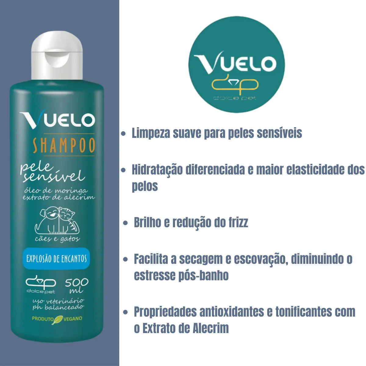 shampoo Pele Sensível Vuelo – Limpeza Delicada e Hidratação para Pelos Sensíveis de Cães e Gatos O Shampoo Pele Sensível Vuelo foi especialmente formulado para pets com pele delicada, garantindo uma limpeza suave sem irritar os olhos nem a pele. Seus ativos especiais proporcionam uma higienização eficaz, cuidando dos pelos com carinho e segurança. O Óleo de Moringa, com suas propriedades antioxidantes e rica composição de ômega 6 e ômega 9, promove uma hidratação diferenciada, melhorando a elasticidade dos fios e deixando-os mais saudáveis. Além disso, o Extrato Vegetal de Alecrim limpa profundamente e tonifica os pelos, proporcionando frescor e leveza. O Silicone, com suas propriedades condicionantes, ajuda a dar brilho, reduz o frizz e facilita a secagem e escovação, tornando o processo pós-banho mais rápido e confortável para o seu pet. Indicado para pets de todas as idades, o Shampoo Pele Sensível Vuelo é a escolha ideal para garantir uma limpeza delicada e eficiente. Benefícios: Limpeza suave para peles sensíveis Hidratação diferenciada e maior elasticidade dos pelos Brilho e redução do frizz Facilita a secagem e escovação, diminuindo o estresse pós-banho Propriedades antioxidantes e tonificantes com o Extrato de Alecrim Indicado para cães e gatos de qualquer idade Dê ao seu pet o conforto e cuidado que ele merece com o Shampoo Pele Sensível Vuelo – a escolha perfeita para peles delicadas e pelos saudáveis. Modo de uso: Espalhe o Shampoo Pele Sensível Vuelo sobre os pelos molhados, da cabeça em direção à cauda, massageando até obter uma espuma homogênea e abundante em toda a pelagem. Enxágue bem. Se necessário, repita o procedimento. Para resultados ainda melhores, utilize o condicionador Vuelo na sequência. Precauções: Produto de uso externo. Não ingerir. Evitar contato direto com os olhos. Armazenar o produto em lugar fresco, seco e protegido da luz solar direta. Manter longe do alcance de crianças e de animais domésticos. Ocorrendo irritação da pele, enxaguar com água em abundância, suspender uso do produto e procurar orientação de médico veterinário. Composição: Água, lauril éter sulfosuccinato de sódio, cocoamidopropil betaína, dietanolamida ácido graxo de coco, silicone, distearato de glicol, poliquatérnio 10, óleo de moringa, extrato vegetal de alecrim, conservante e fragrância.