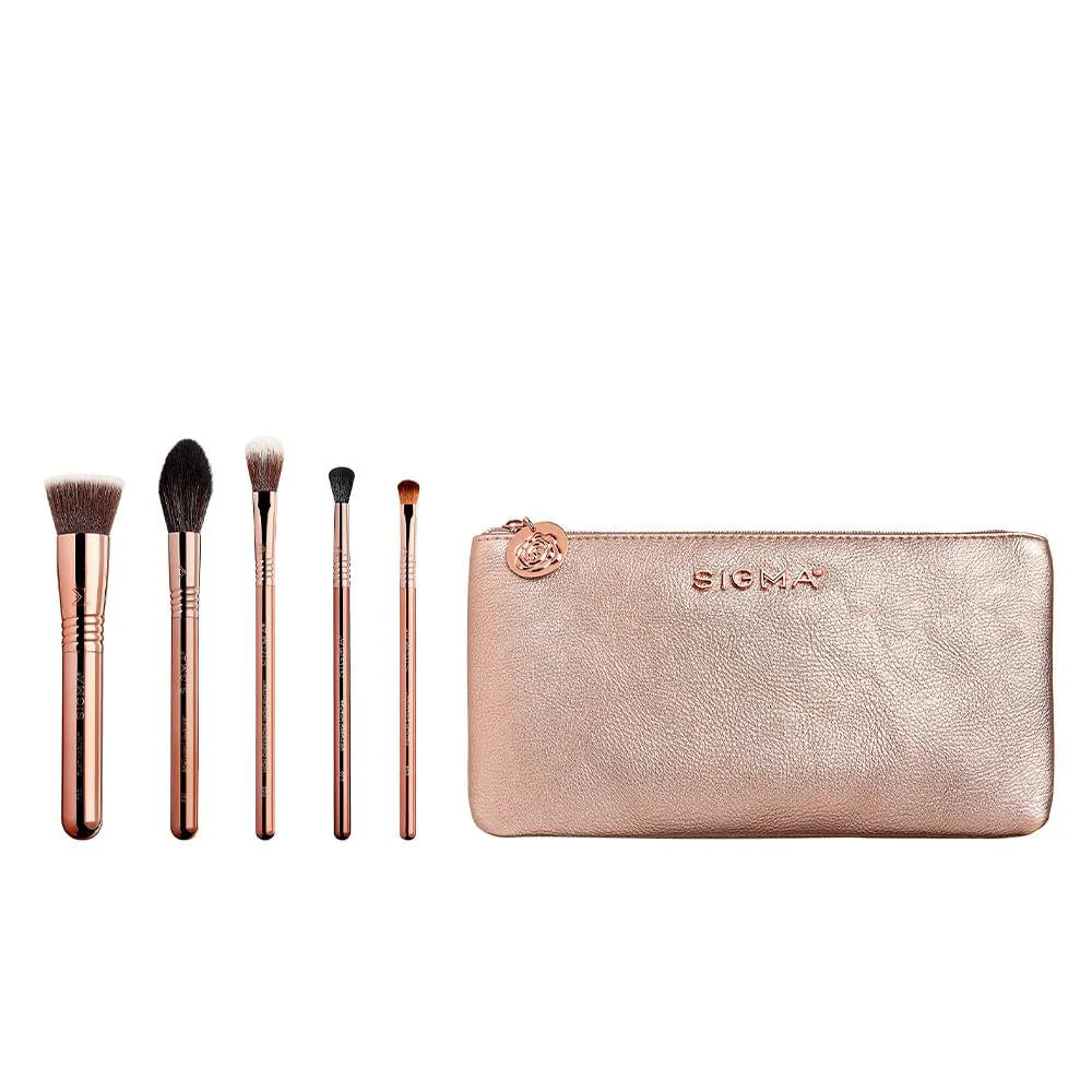 Obtenha o glamour com este extravagante kit de 5 premiados pincéis mais uma linda necessarie feita a mão. Para garantir a mais alta qualidade, estes pincéis em ouro rosé apresentam ponteira de intertravamento patenteadas e ultrasoft SigmaTech ® e Fibras Sigmax ® projetadas para aplicar e misturar todos os seus produtos e fórmulas favoritos para um acabamento luxuoso.