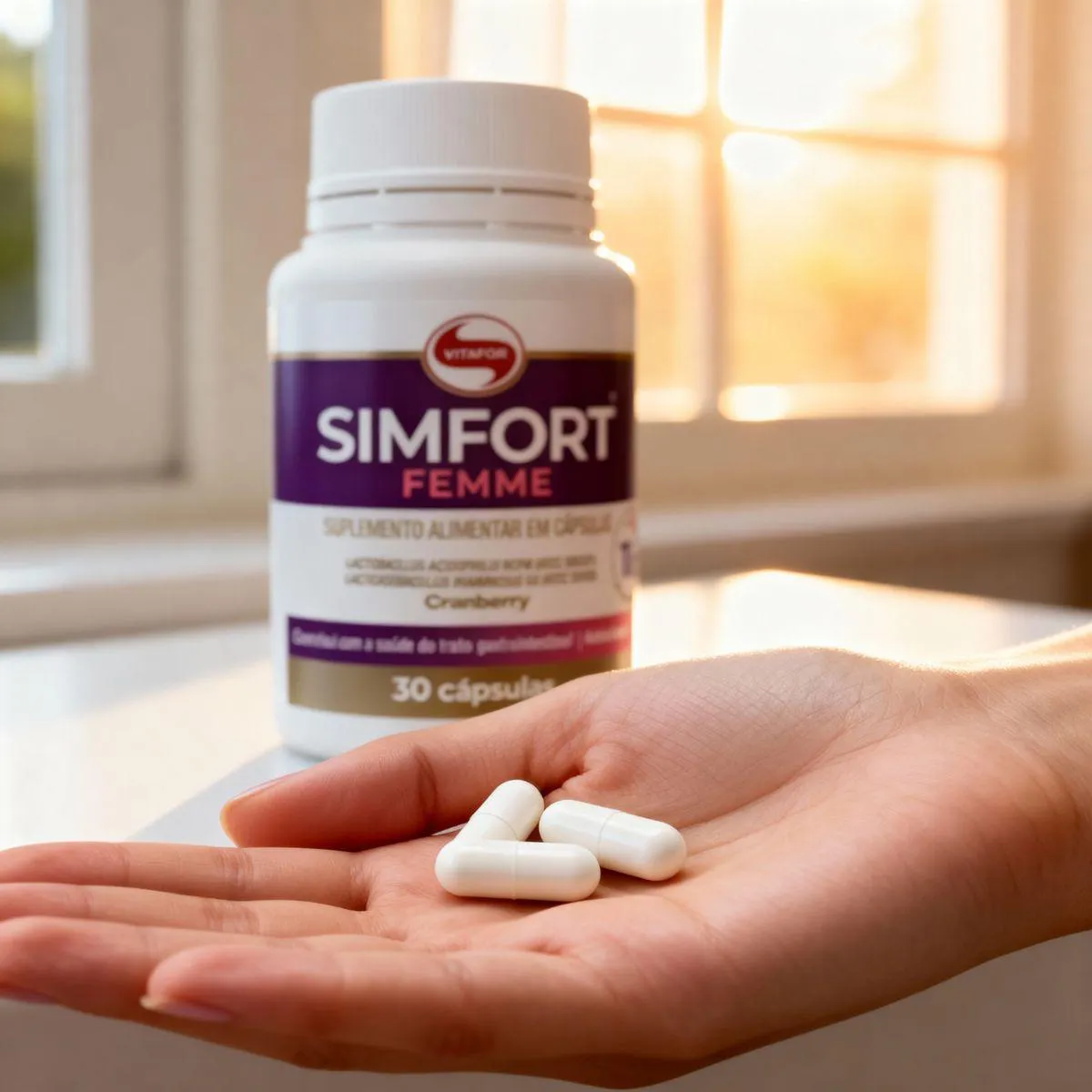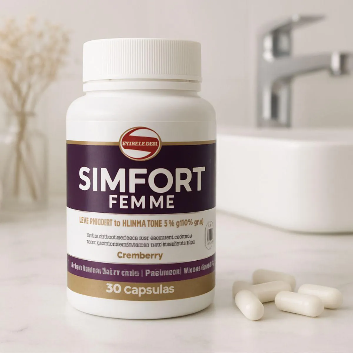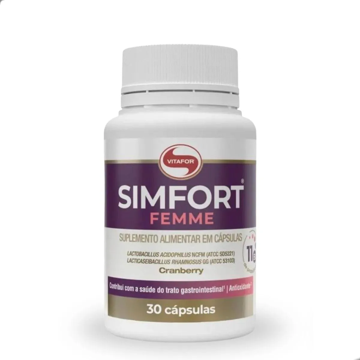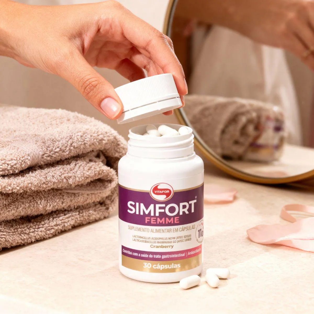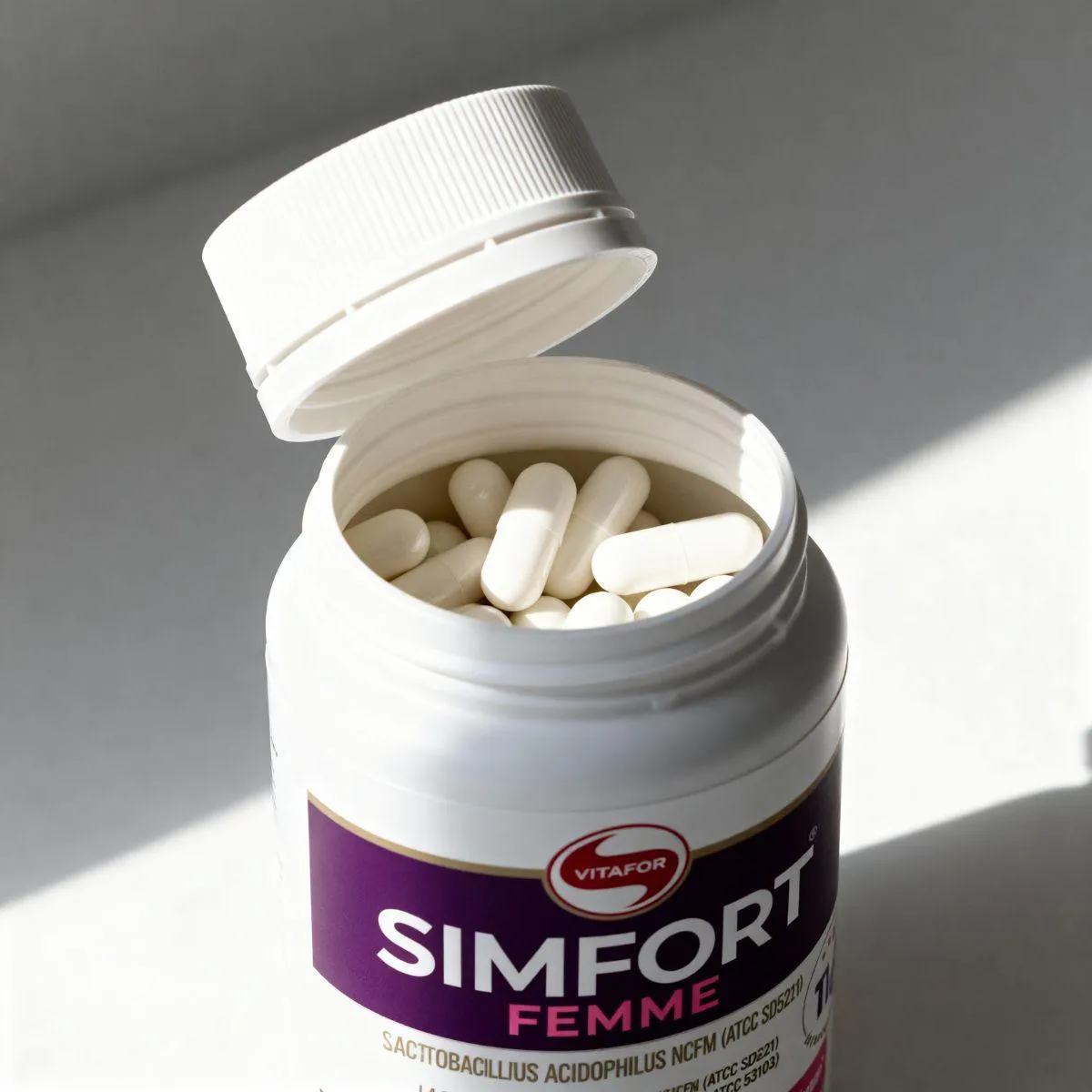 O Simfort Femme é um suplemento probiótico em cápsulas desenvolvido especificamente para mulheres, com 11 bilhões de probióticos em uma fórmula limpa e minimalista. Serve para auxiliar no bem-estar feminino, oferecendo suporte nutricional de forma prática e conveniente, permitindo que mulheres integrem facilmente um complemento probiótico em suas rotinas diárias, com um frasco compacto que possibilita consumo em diferentes momentos e ambientes.