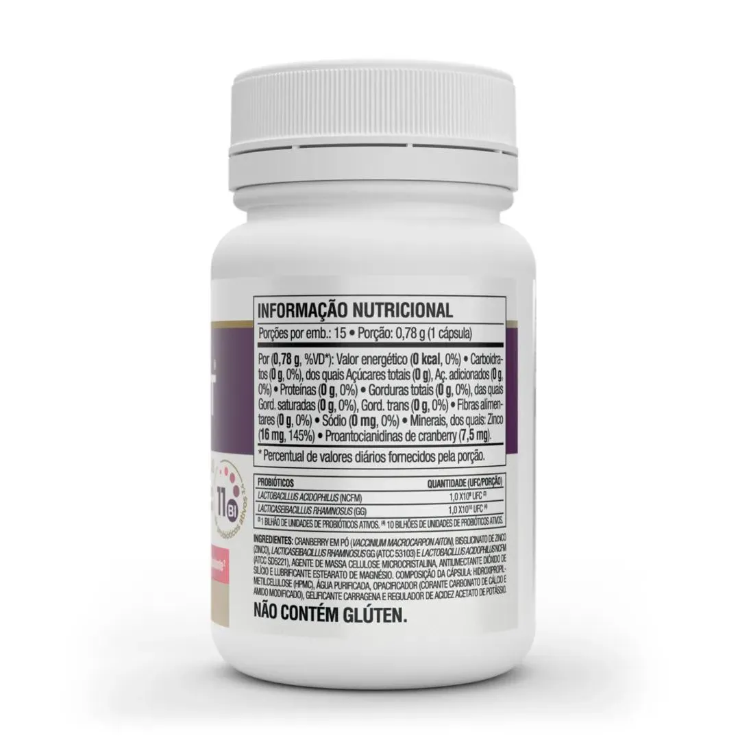 Suplemento alimentar composto por cranberry, associação das cepas probióticas: Lacticaseibacillus rhamnosus GG (ATCC 53103) e Lactobacillus acidophilus NCFM (ATCC SD5221), além de zinco. Benefícios:- Lacticaseibacillus rhamnosus GG (ATCC 53103) e Lactobacillus acidophilus NCFM (ATCC SD5221) podem contribuir com a saúde do trato gastrointestinal;