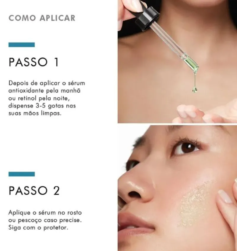 - Aplique uma pequena quantidade do sérum com leves toques suaves em todo o rosto.