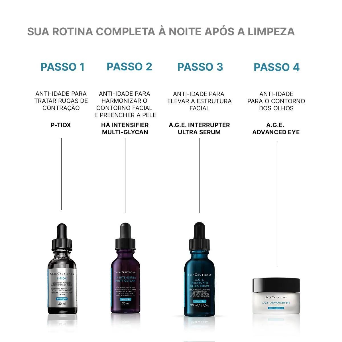 O Skinceuticals Age Interrupter Ultra Serum contém uma combinação de ativos potentes que atuam na regeneração e sustentação da pele. Seus componentes estimulam a produção de colágeno e elastina, promovendo firmeza e efeito lifting visível. A fórmula foi desenvolvida para reduzir a degradação das fibras de suporte da pele, corrigindo rugas, linhas finas e sinais de flacidez, garantindo um aspecto rejuvenescido e saudável.