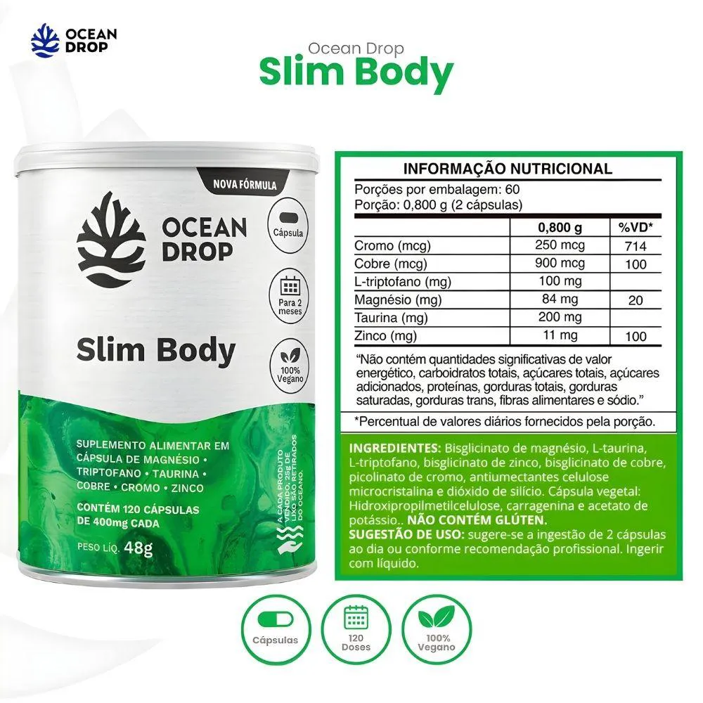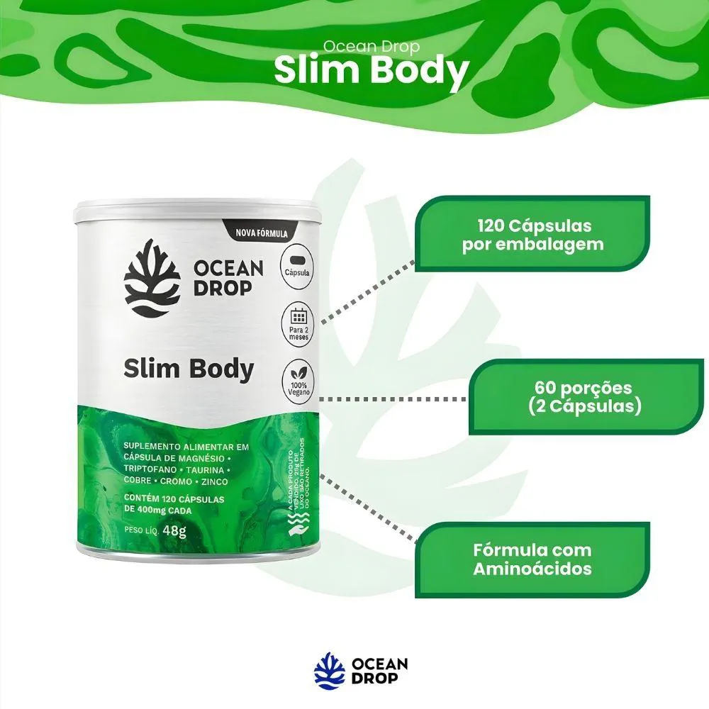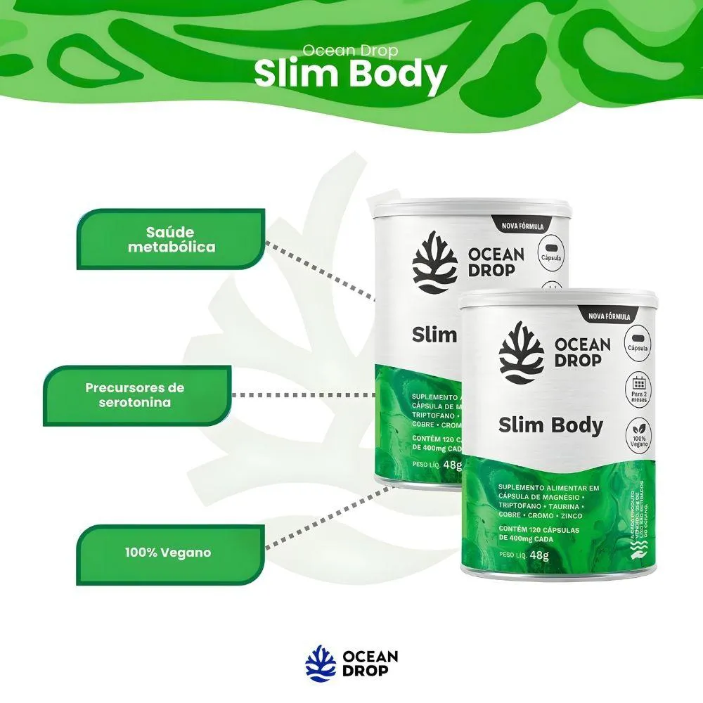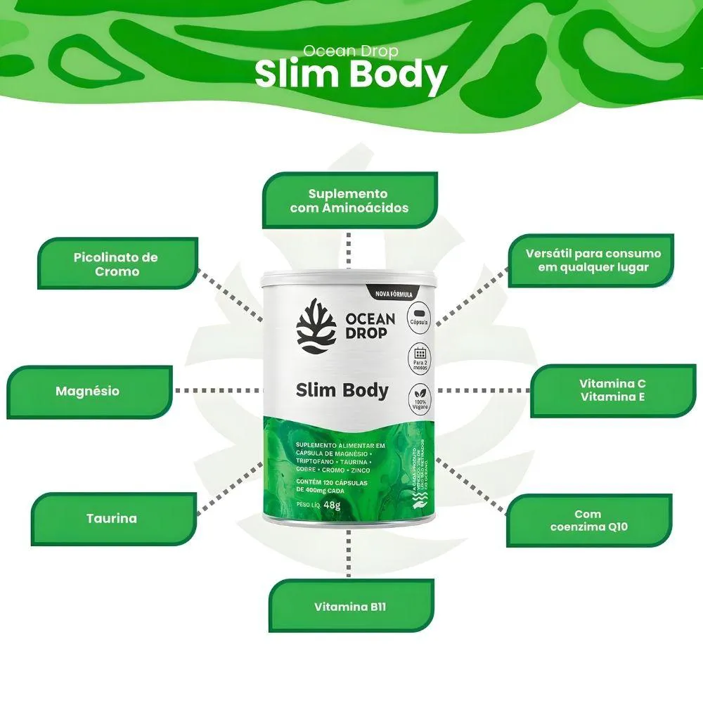 Slim Body – Ocean Drop O Slim Body da Ocean Drop é um suplemento alimentar desenvolvido para complementar a rotina nutricional diária. Sua formulação é 100% vegana e pode ser utilizada por pessoas que buscam apoio ao metabolismo energético como parte de um estilo de vida equilibrado. Apresentado em cápsulas, é uma opção prática para o consumo diário, podendo ser incluído em rotinas voltadas ao cuidado com a alimentação e bem-estar geral. Benefícios do produto: