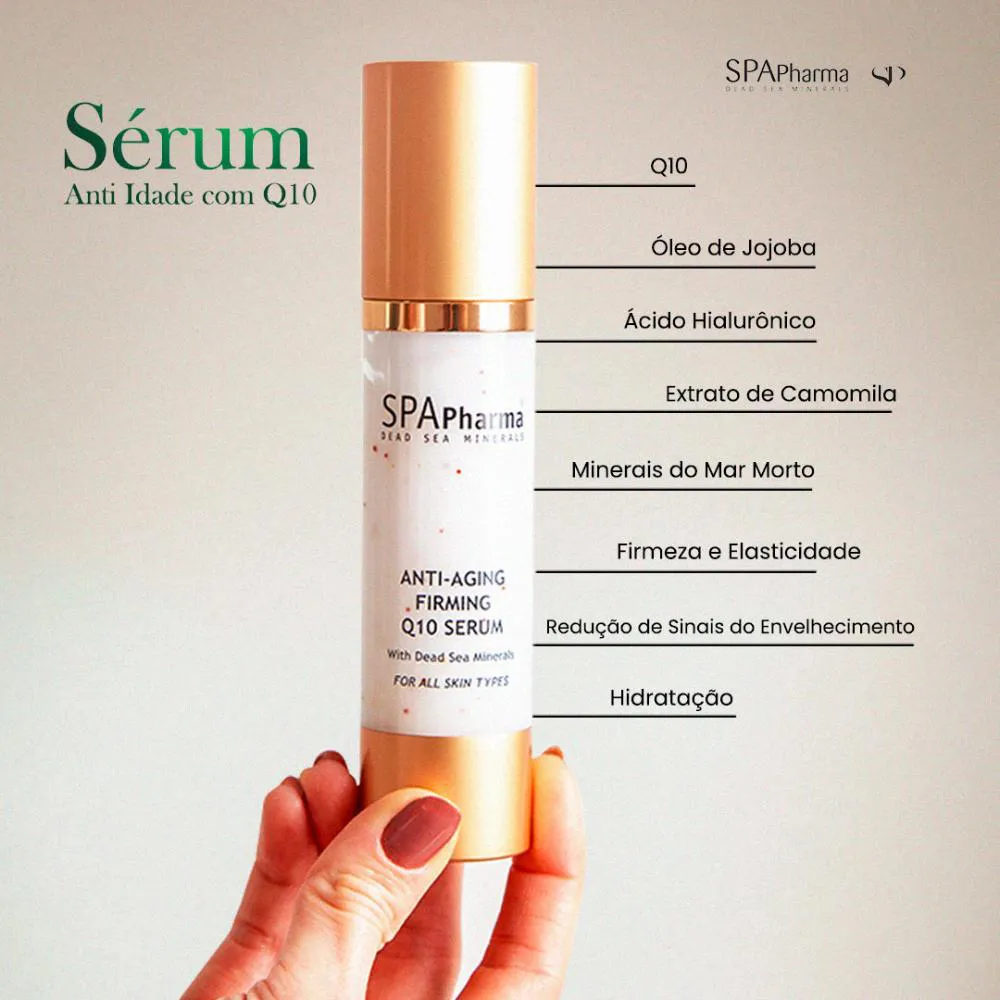 O Sérum Firmador Anti-Idade SPA Pharma é um produto cosmético antienvelhecimento desenvolvido para melhorar a firmeza e a aparência da pele, com uma fórmula enriquecida com Coenzima Q10, minerais do Mar Morto, Ácido Hialurônico, Aloe Vera e Óleo de Jojoba. Serve para proteger a pele contra danos ambientais, reduzir sinais visíveis de envelhecimento, suavizar rugas e linhas finas, promover firmeza e elasticidade, hidratar intensamente e deixar a pele com aparência mais jovem, saudável e radiante.