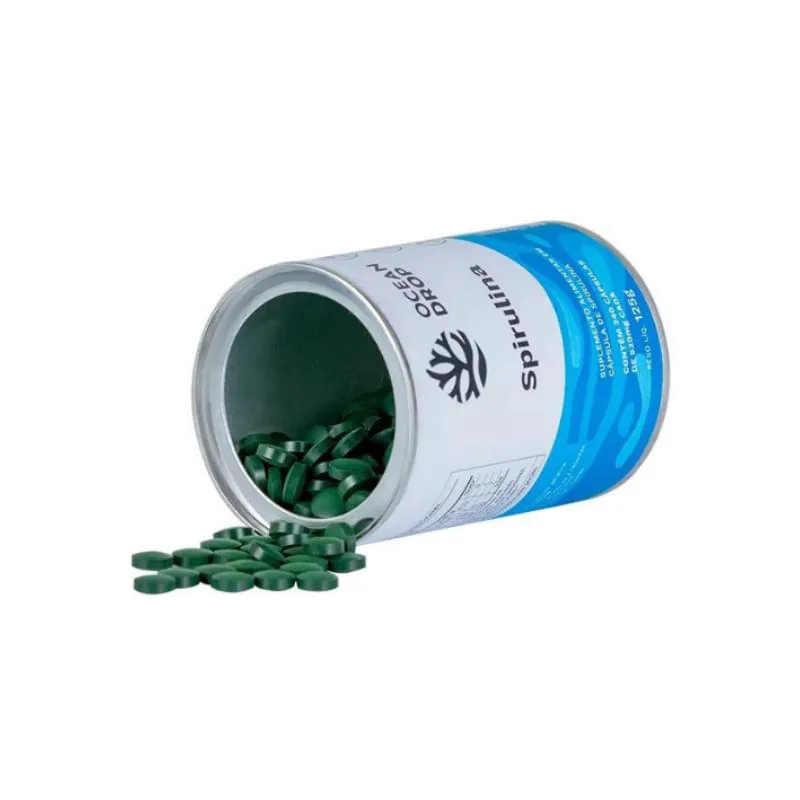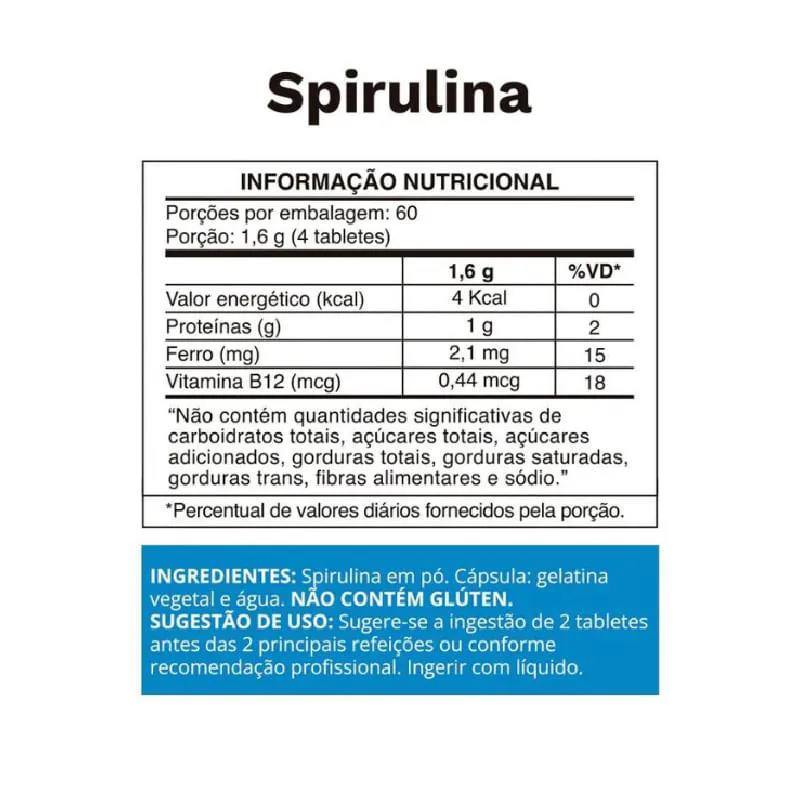 A Spirulina em tabletes da Ocean Drop é 100% pura, desenvolvida apenas com spirulina em pó que é poderosa alga-azul rica em nutrientes e compostos bioativos, além disso, é um produto vegano e sem glúten.