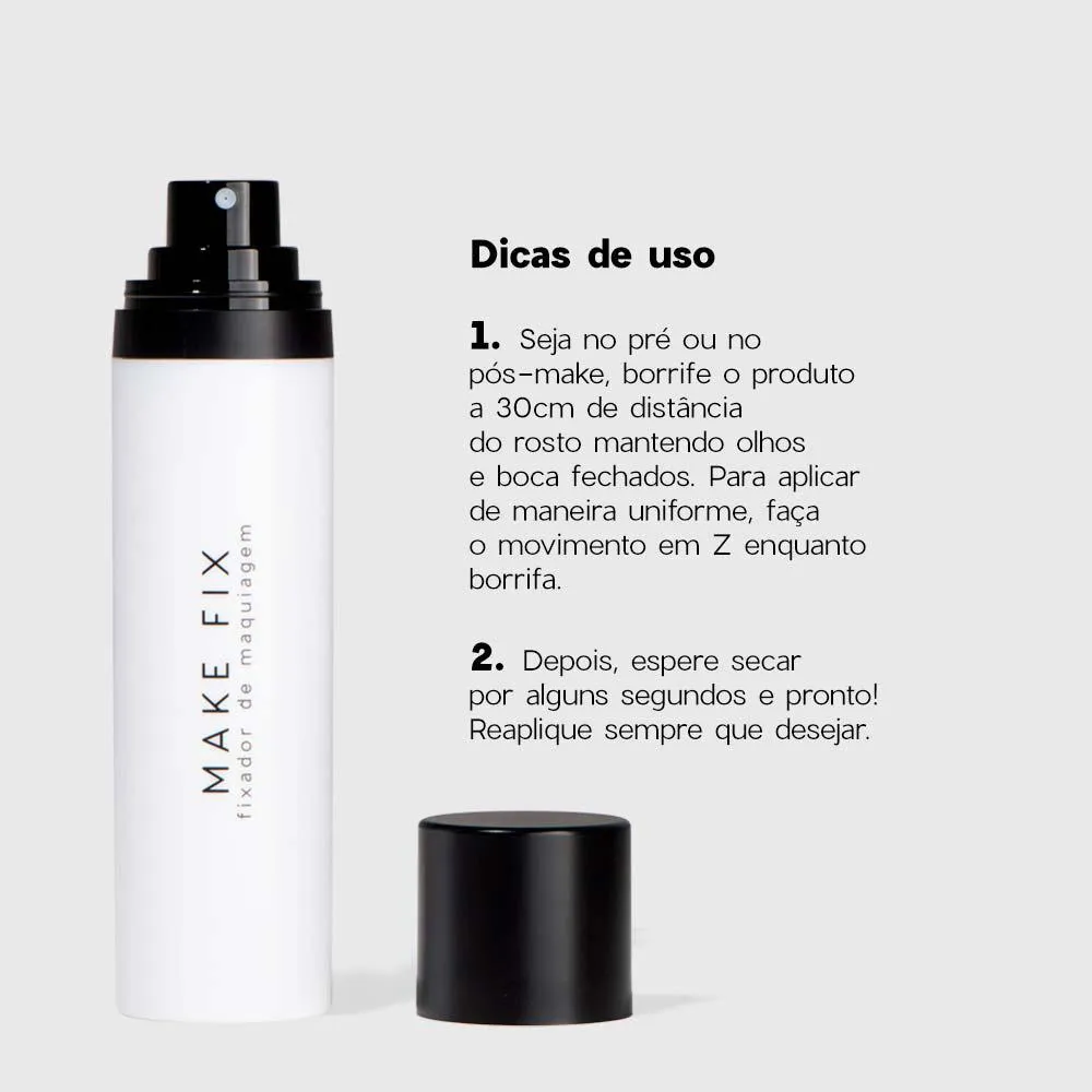 Versátil, o Make Fix pode ser utilizado antes da make, no preparo da pele, conferindo hidratação com efeito calmante. Após a produção, ele fixa a maquiagem no lugar, refresca e mantém o brilho natural da pele.