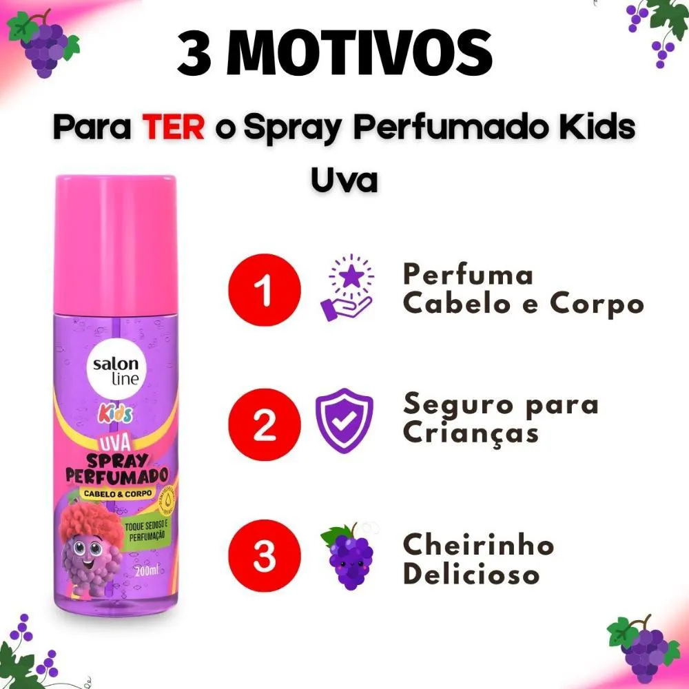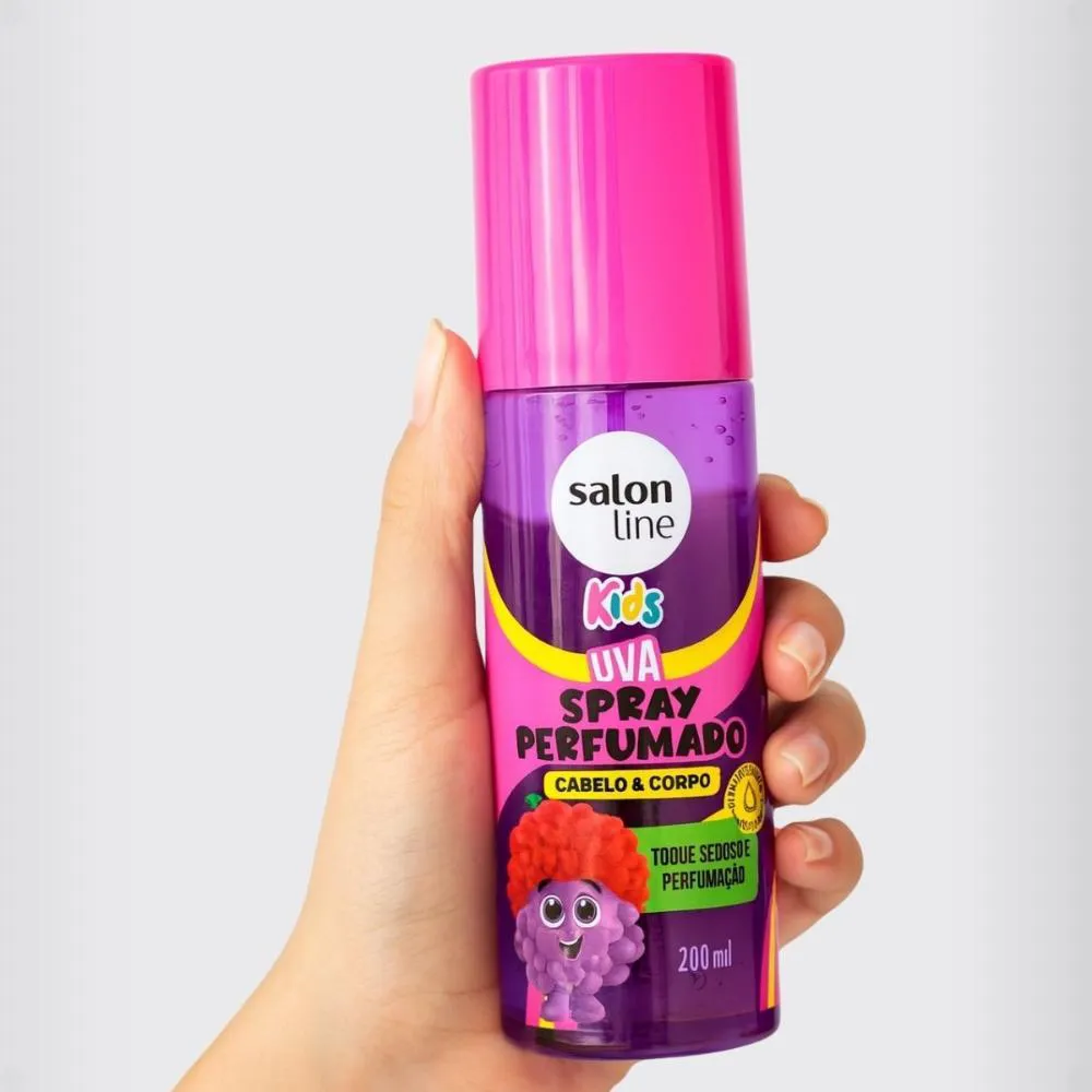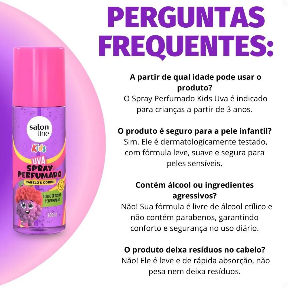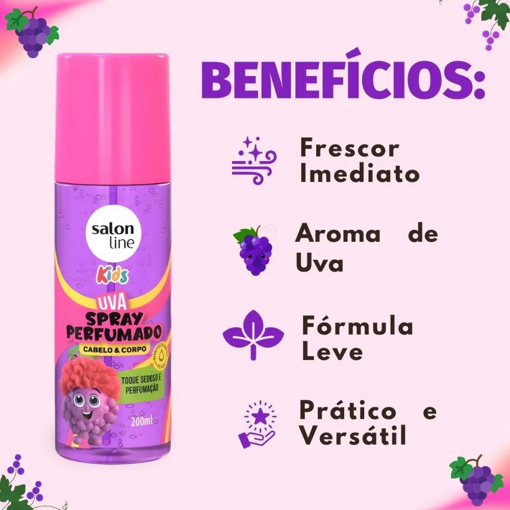 O Spray Perfumado Cabelo e Corpo Salon Line Kids Uva 200ml é a escolha ideal para proporcionar perfumação imediata e divertida, prolongando o frescor e o delicioso cheirinho de uva nos fios e na pele das crianças. Desenvolvido para o público infantil a partir de 3 anos, este spray garante uma experiência sensorial agradável, deixando o cabelo macio, cheiroso e com brilho natural, sem pesar. Sua fórmula leve e cuidadosamente elaborada atende ao desejo dos pais por produtos seguros e eficazes que cuidem da higiene e bem-estar dos pequenos.Benefícios Principais