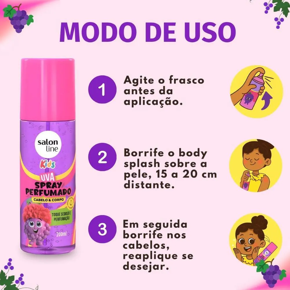 O Spray Perfumado Cabelo e Corpo Salon Line Kids Uva é perfeito para o uso diário, mantendo a pele e os cabelos dos pequenos sempre perfumados e com sensação de frescor. Ideal para ser aplicado após o banho, antes de sair para a escola ou para um passeio, ou a qualquer momento para um toque divertido e cheiroso.Modo de Uso/Aplicação
