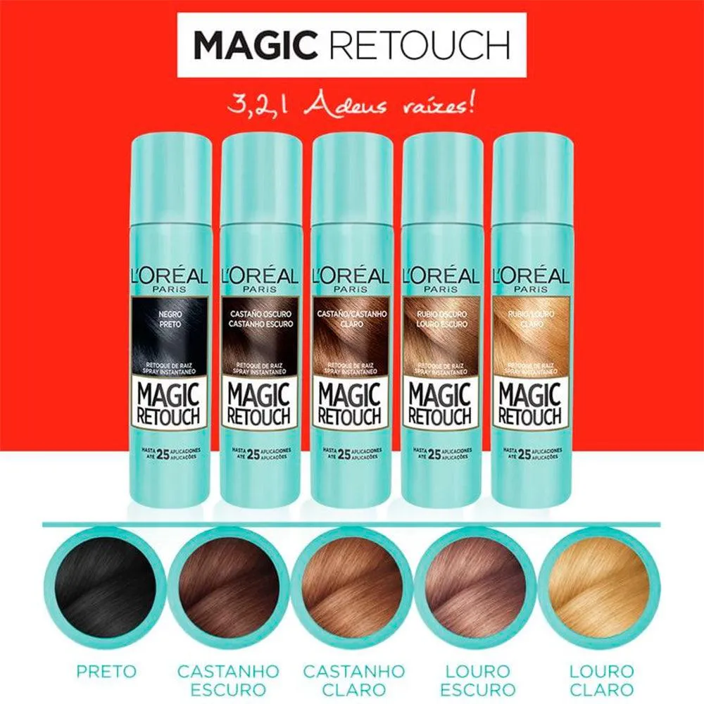 spray Retoque de Raiz L'Oréal Magic Retouch é um spray instantâneo com cor colore temporariamente a raiz e cobre os fios brancos em até 3 segundos. Por isso, pode ficar tranquila se não você não conseguiu retocar com tinta a tempo daquele compromisso importante.